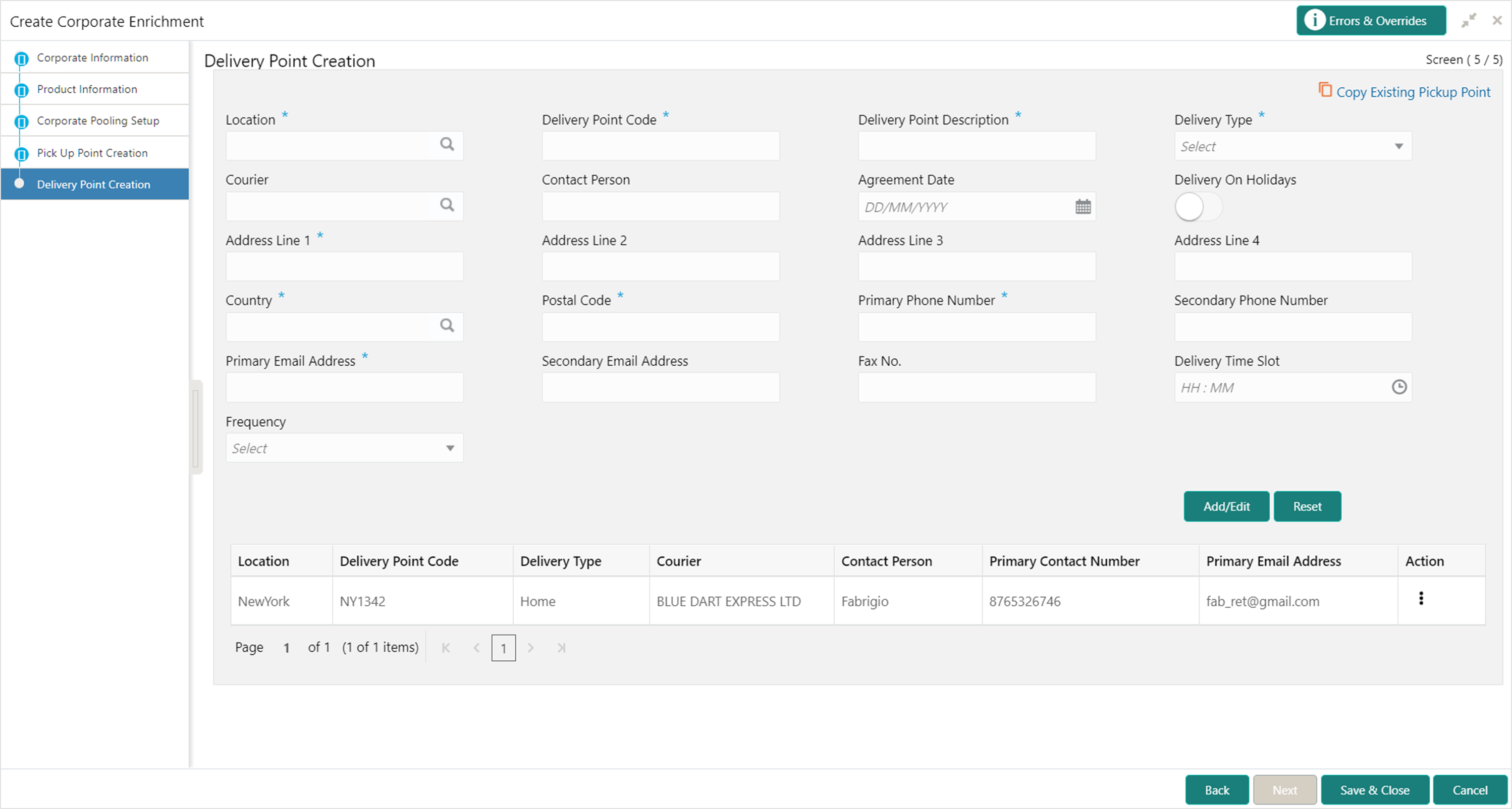 - Specify the fields on Create Corporate Enrichment - Delivery Point Creation screen.For more information on fields, refer to the field description table.