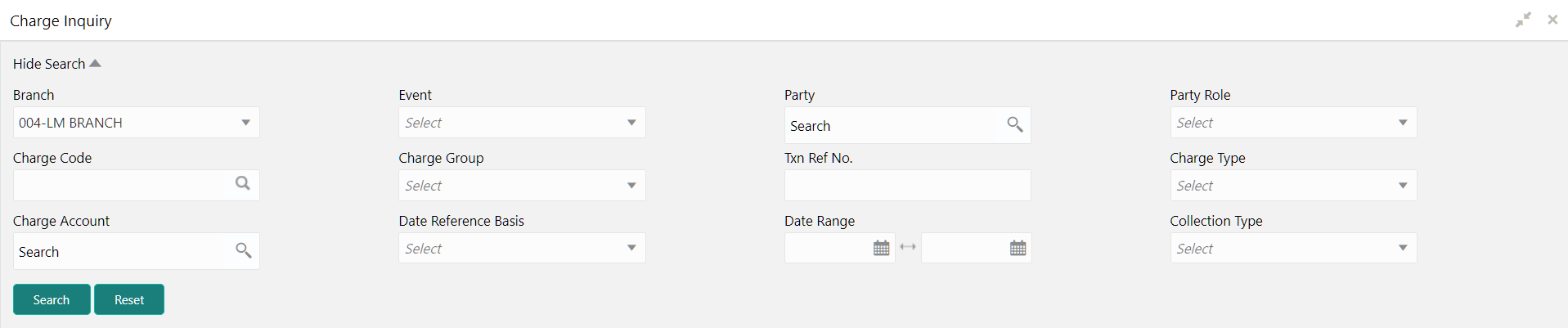 Field Description Branch Select the required branch to proceed further. By default, the branch of the logged-in user is selected. Event Select the event to which the charge is applicable. Party Click the search icon and select the party that has been charged. Party Role Select the role of the party. Charge Code Click the search icon and select the charge code to inquire for. Charge Group Select the group to which the charge code belongs. Txn Ref No. Specify the reference number or charge reference number to inquire for. Charge Type Select the value to specify whether the type of charge is Debit or Credit. Charge Account Click the Search icon and select the account in which charges takes effect. Date Reference Basis Select the type of date range to be applied for search. - Calculation Date – To list all relevant charges only on the basis of calculation irrespective of its posting details.