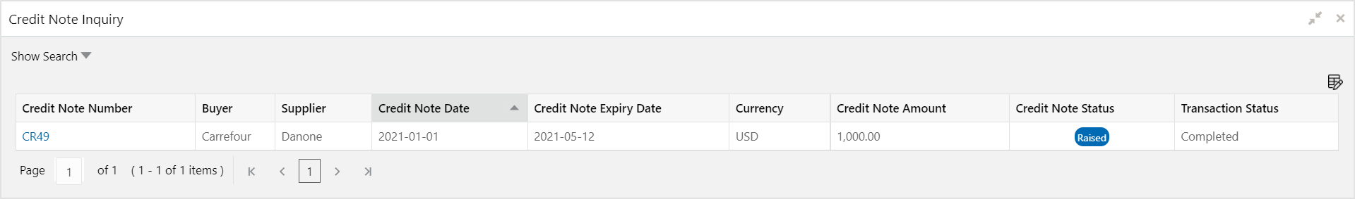 Credit Note Status Select the current status of credit note to filter the search result. Reconciliation Status Select the recon status of the credit note to filter the search result. Date Reference Basis Select the type of date range to be applied for search. Date Range Click the Calendar icon and select the start date and end date of the date range. Currency Select the currency of the transaction. Amount From Specify the minimum credit note amount to be considered for the search. Amount To Specify the maximum credit note amount to be considered for the search. - Click Search to view the search results.The Credit Note Inquiry - Search Results screen displays.