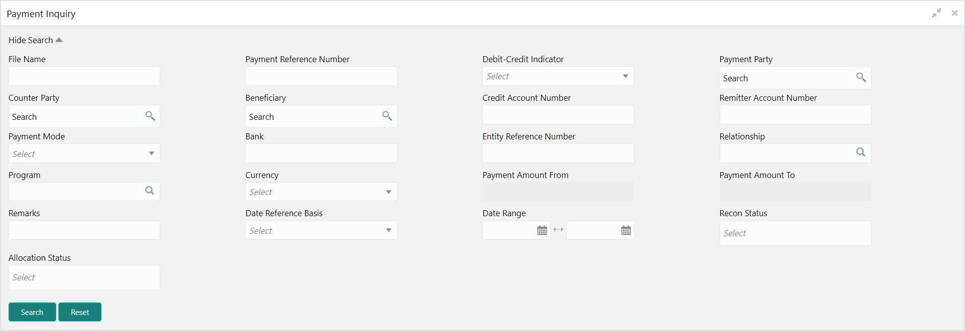 Debit-Credit Indicator Select the payment type as debit or credit to search for. Payment Party Click the Search icon and select the party who has made the payment. Counter Party Click the Search icon and select the counterparty. Beneficiary Click the Search icon and select the beneficiary of the payment. Credit Account Number Specify the account number into which the payment is credited. Remitter Account Number Specify the account number from which the payment is debited. Payment Mode Select the mode through which payment is made. Bank Specify the bank name included in the payment details. Entity Reference No Specify the entity reference number linked with the payment. Relationship Click the Search icon and select the relationship code of the payment party or counterparty. Program Click the Search icon and select the program of the payment party or counterparty. This field is applicable only for OBSCF system.