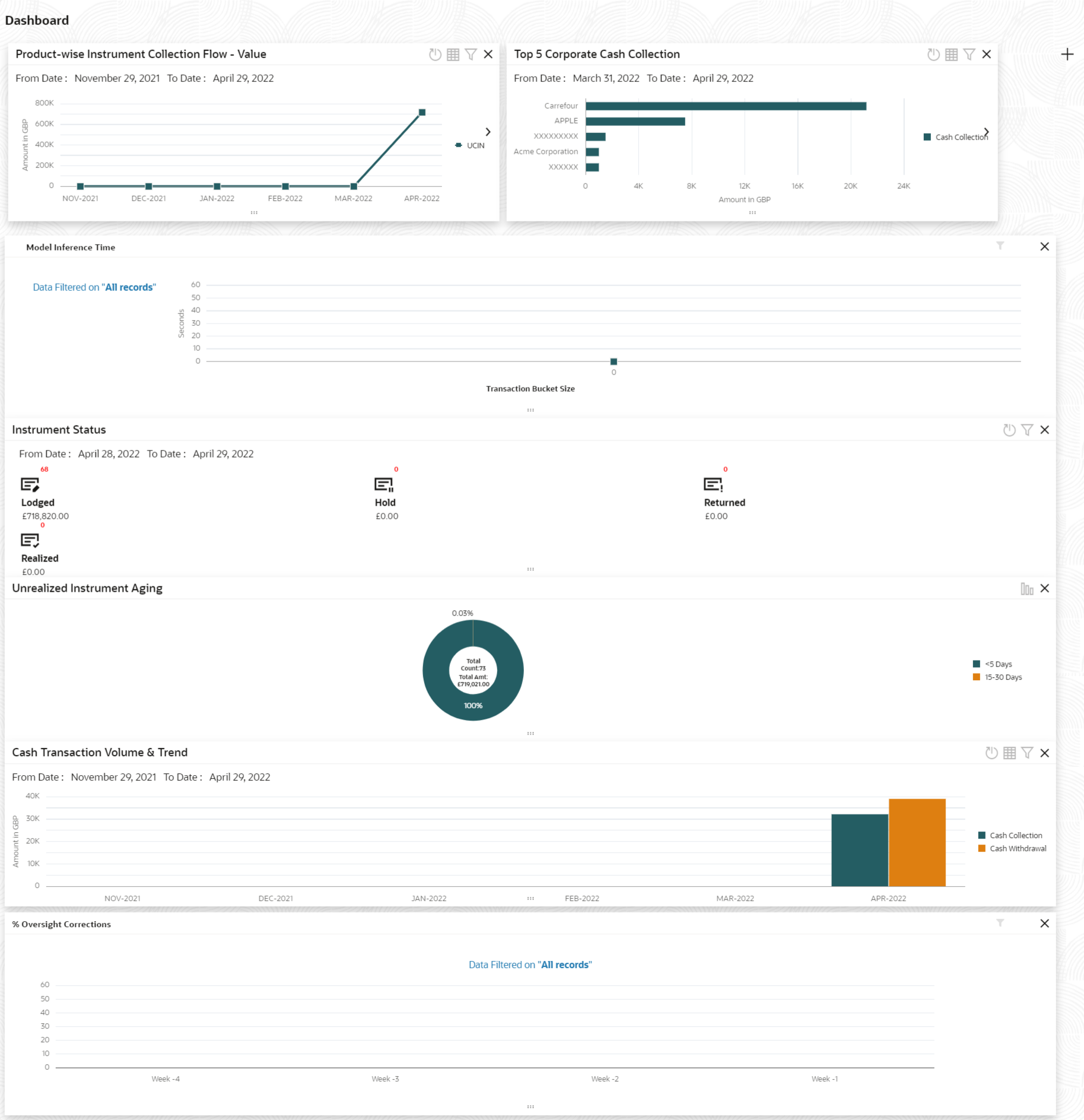 Successfully signing into the application displays the Dashboard as your home screen. Dashboard displays a gist/summary that is internal to the bank. It is a collection of various portlets that are displayed based on your role and access rights. The Dashboard enables you to perform various analytical functions. You can drag and move different portlets, resize/auto adjust the size, and expand/collapse the portlets.