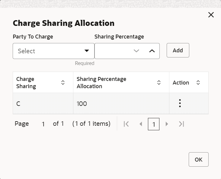Add/Override Charges Displays the details of new charges added in this grid. Default Charges Displays the default charges configured for the selected event in this grid, if the Inherit Charges is selected as Inherit Default Charges. These charges cannot be modified. - Click Sharing Percentage Allocation link to specify the sharing percentage for each party.The Charge Sharing Allocation popup screen displays.