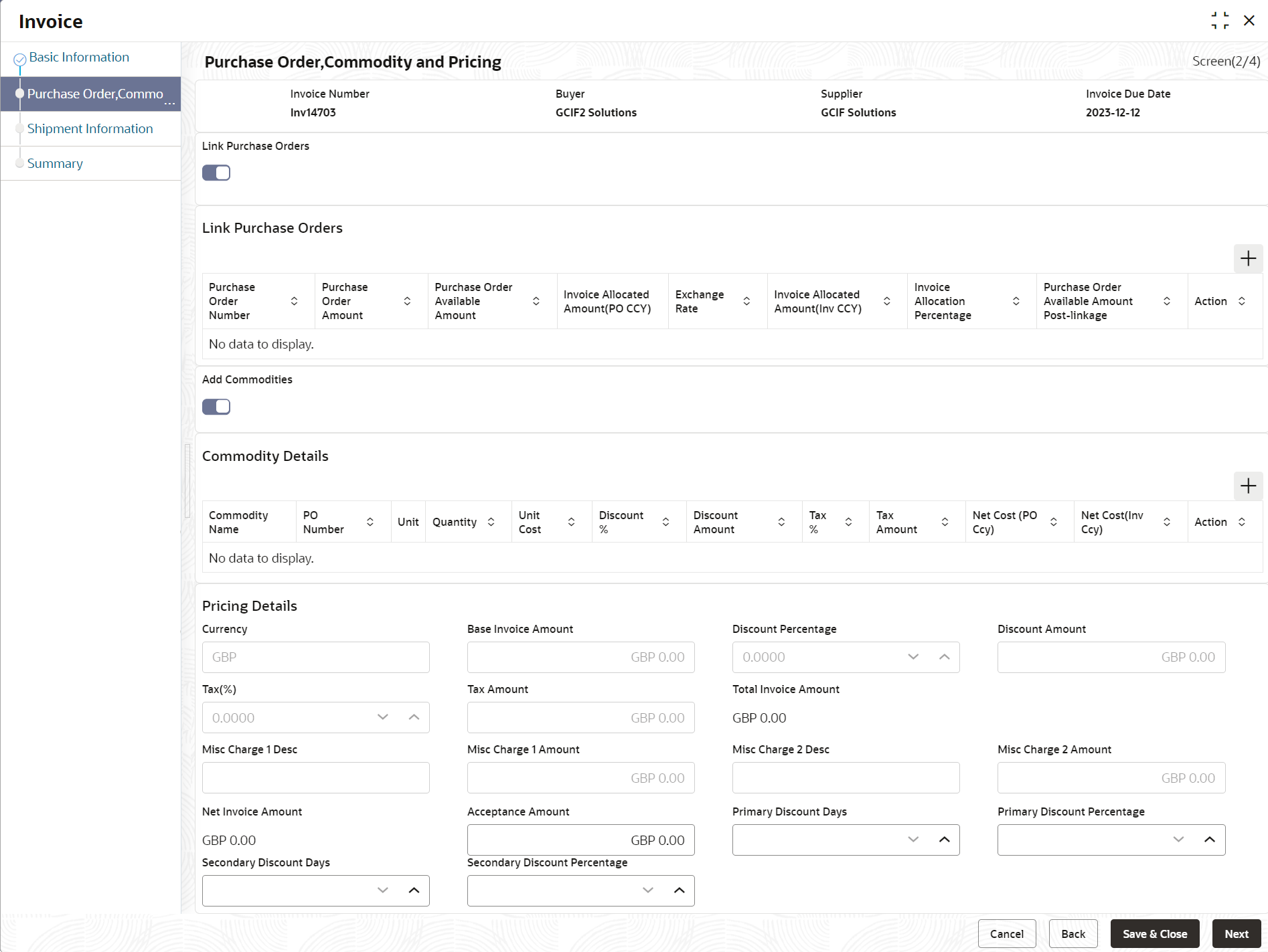- Click Next on Basic Information tab.The Invoice - Commodity and Pricing screen displays.For more information on fields, refer to the field description table.