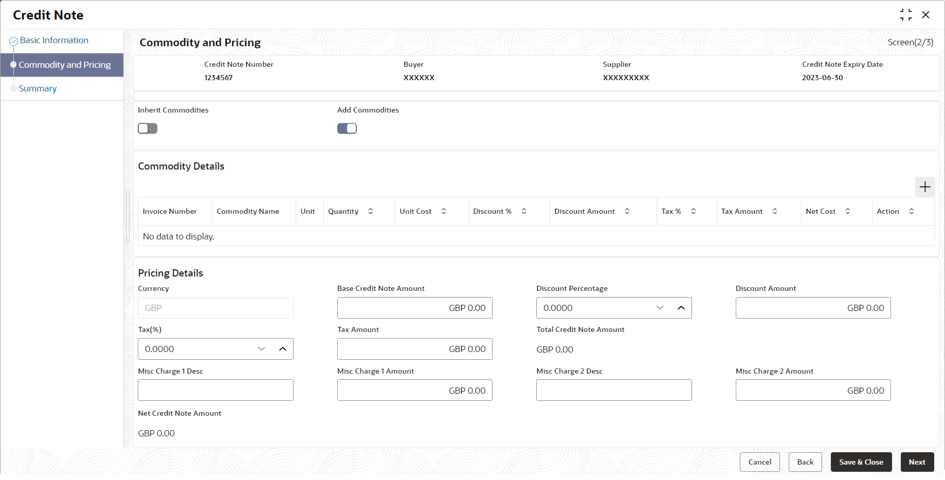 - Click Next on Basic Information tab.The Credit Note - Commodity and Pricing screen displays.