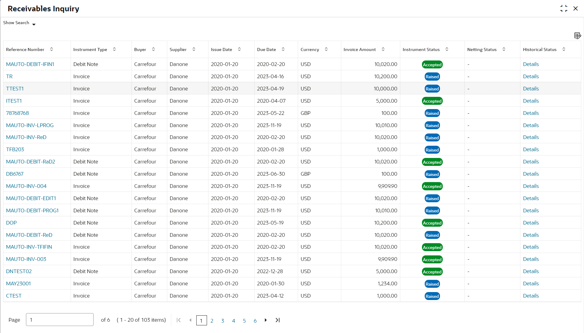 This topic describes the systematic instruction to search for the invoices/debit notes based on the various criteria such as File Reference Number, External Invoice Number, Internal Invoice Reference Number, Buyer/Supplier, Status, Due Dates, etc.