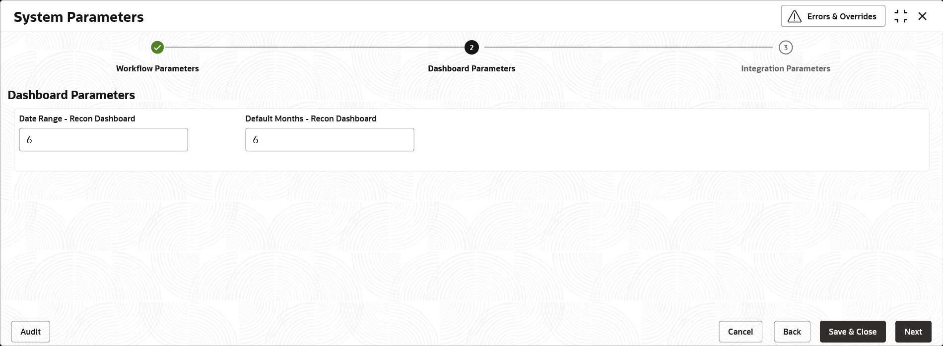 Field Description Date Range - Recon Dashboard Specify the number of days for which the reconciliation details has to be displayed on the dashboard. Default Months - Recon Dashboard Specify the number of months for which the reconciliation details has to be displayed on the dashboard. - Click Next button.The System Parameters - Integration Parameters screen displays.