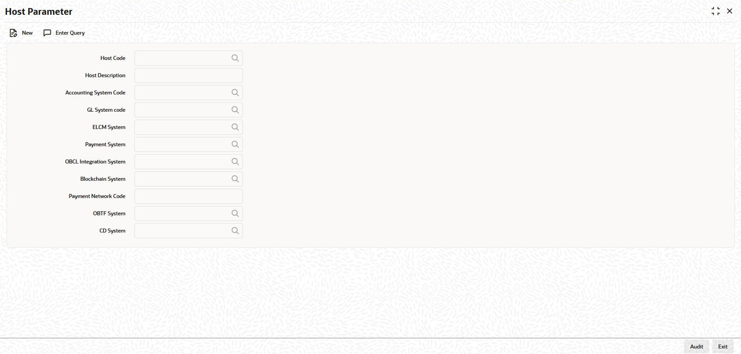 Field Description Host Code Specify the host code. Host Description Specify the brief description for the host. Accounting System Code Specify the accounting system code. For example, OLINTSYS Payment System Specify the payment system. For example, INTBANKING ELCM System Specify the ELCM system. For example, OLELCM OBCL Integration System Specify the external system. For example, OLINTSYS, for integration with UBS system. Block Chain System Specify the Block Chain System. For example OLBLKCN. Payment Network Code Specify the Network through which OBPM to send the outbound message, for loan disbursement. For example, SWIFT.