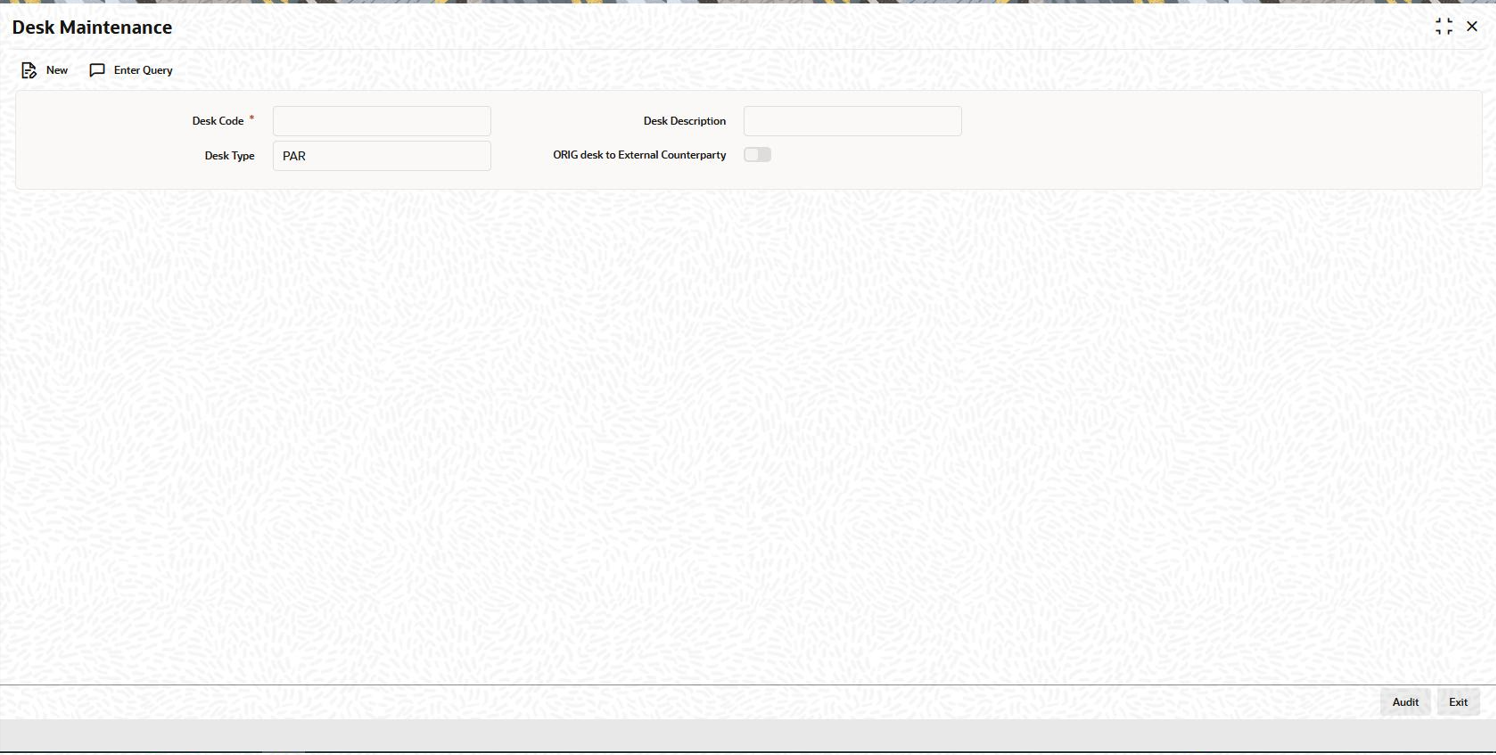 Different types of desks are available for processing the deals at different priorities. You can maintain the details related to desks in Desk Code Maintenance screen.