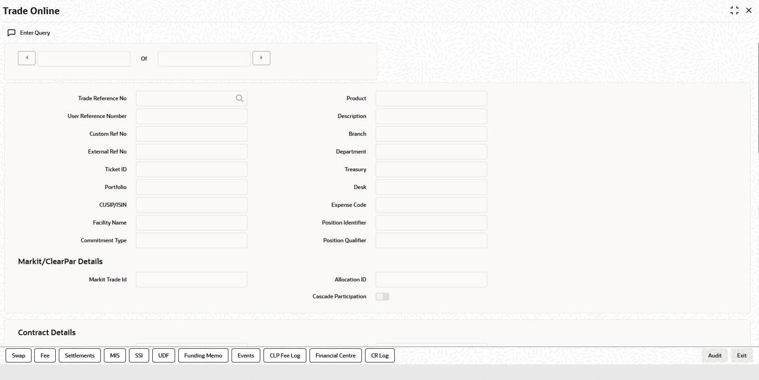 Contract Ref. No. Select the reference number of the contract whose details you want to modify, from the option list provided. This is applicable only for Modify type of trades.