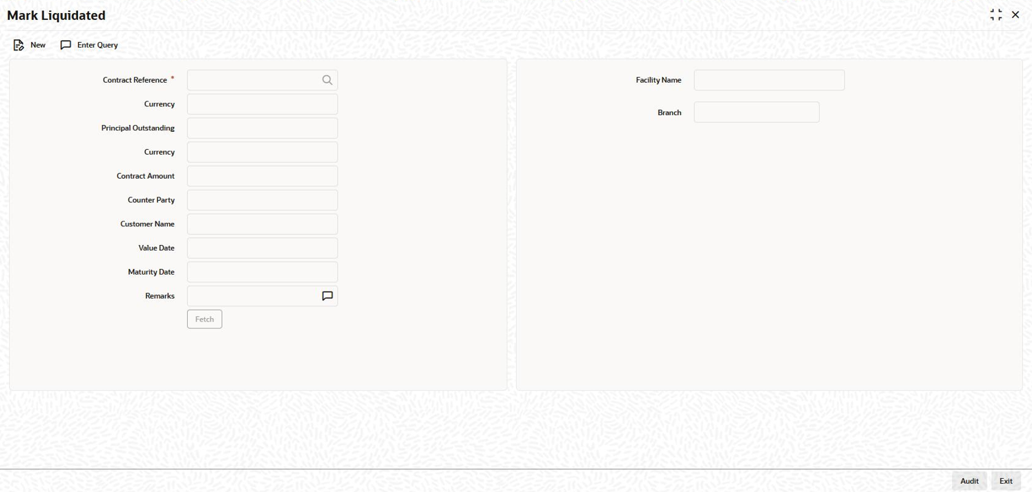 You can only change status from Active to Liquidated; no other status change can be done from this screen.- New - This operation initiates contract status change for a contract. When you click on New button, the Contract Ref No is enabled and you can select the required contract to be liquidated.