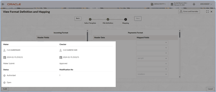 Mapping Details Incoming Format Displays the list of fields defined on the File Definition page. Payments Format Displays the list of fields defined in the Transaction format. Mapped Fields Dropdown to display the Incoming format fields which can be mapped to the Transaction Format fields.