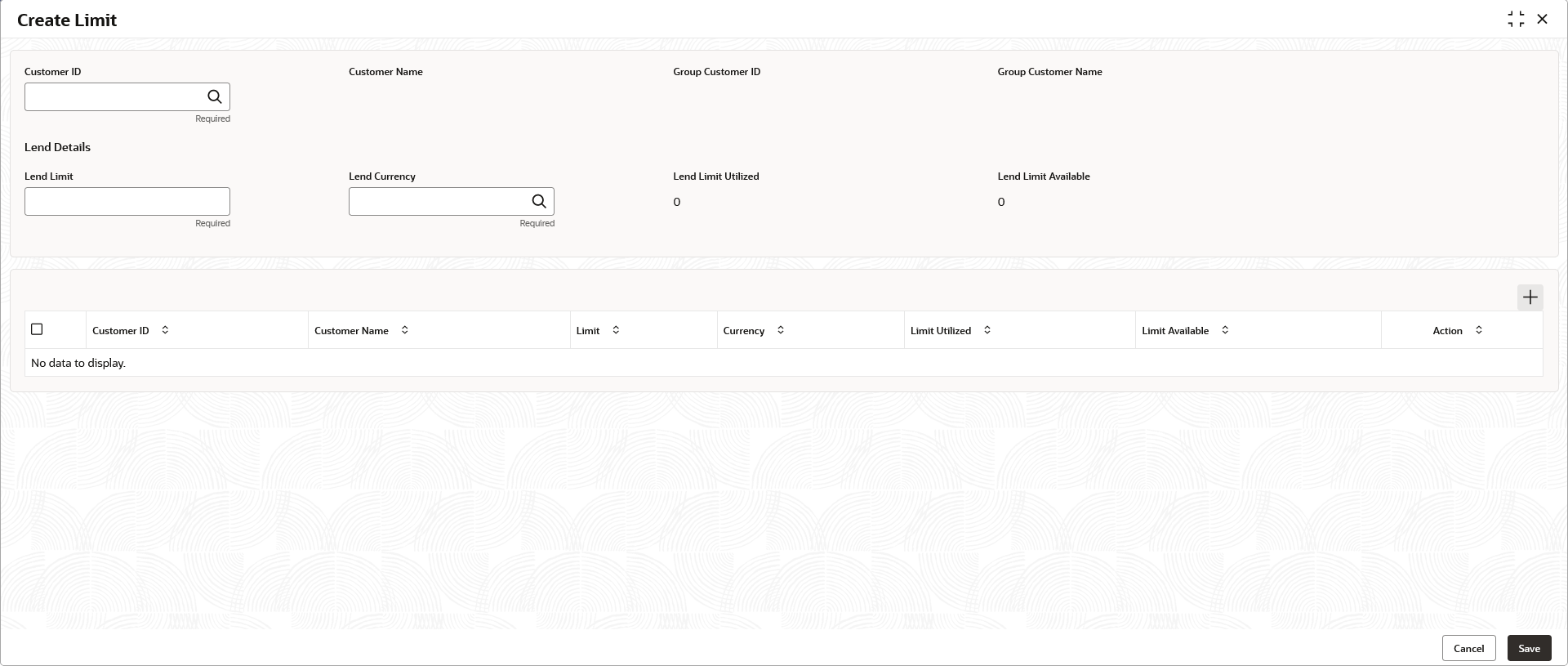 Lend CCY Click Search icon and select the currency in which the lending operation take place. Lend Limit Utilized Displays an overall lend limit utilized by the specific customer under consideration. Lend Limit Available Displays available lend limit for any of the upcoming loan transactions. Customer ID Click Search icon and select the customer ID (from the existing list of customers). Customer Name Displays the customer name on selecting customer ID. Lend Limit Displays an amount that can be lent to the specific customer. Lend Limit Utilized Displays utilized limit by the customer. While creating, it will be zero.