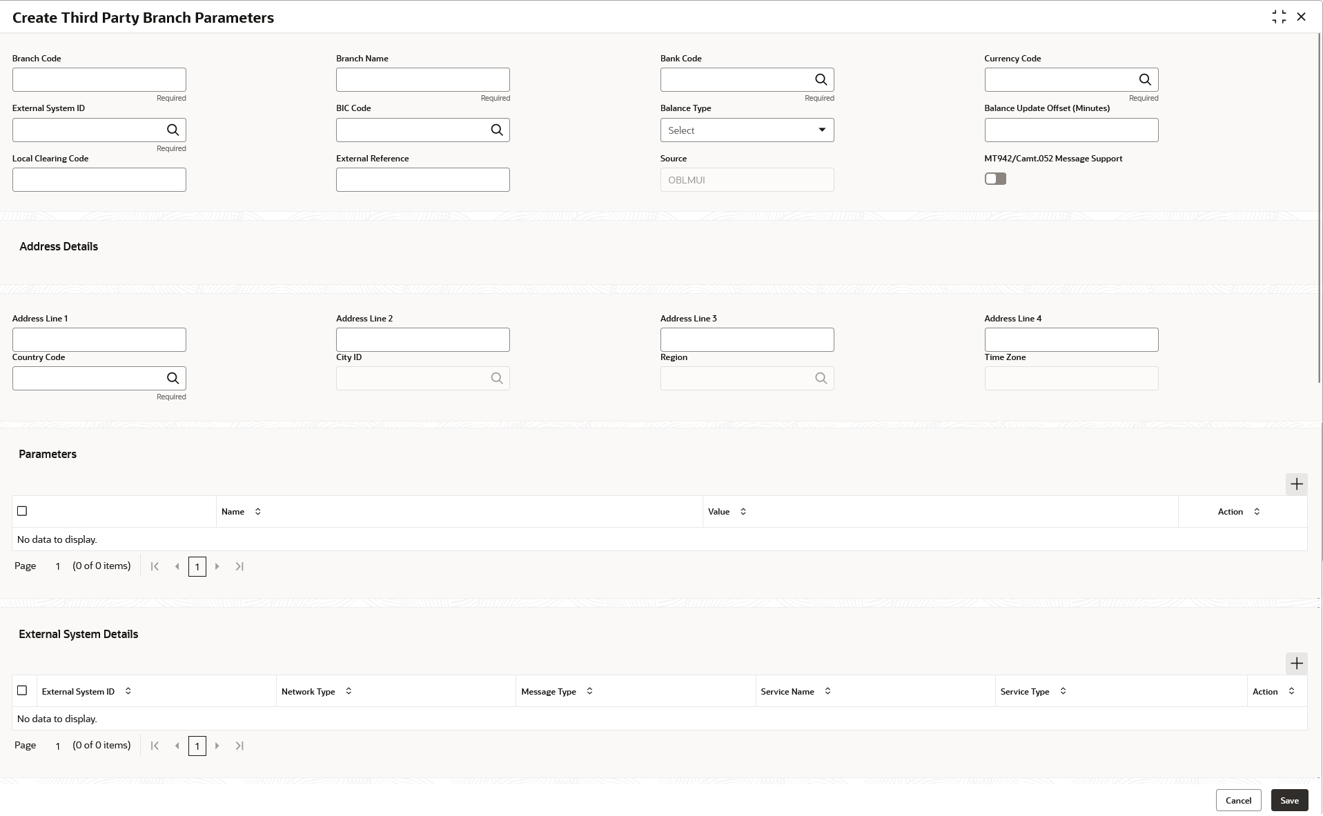 Field Description Branch Code Specify the branch code. Branch Name Specify the name of the branch. Bank Code Select the Search icon to view and select the bank code. Currency Code Select the Search icon to view and select the currency code. External System ID Select the Search icon to view and select the external system ID. BIC Code Select the Search icon to view and select the BIC code. Balance Type Select the balance type from the drop-down list. The available options are:- Online - The account balances are fetched from DDA when sweep happens.