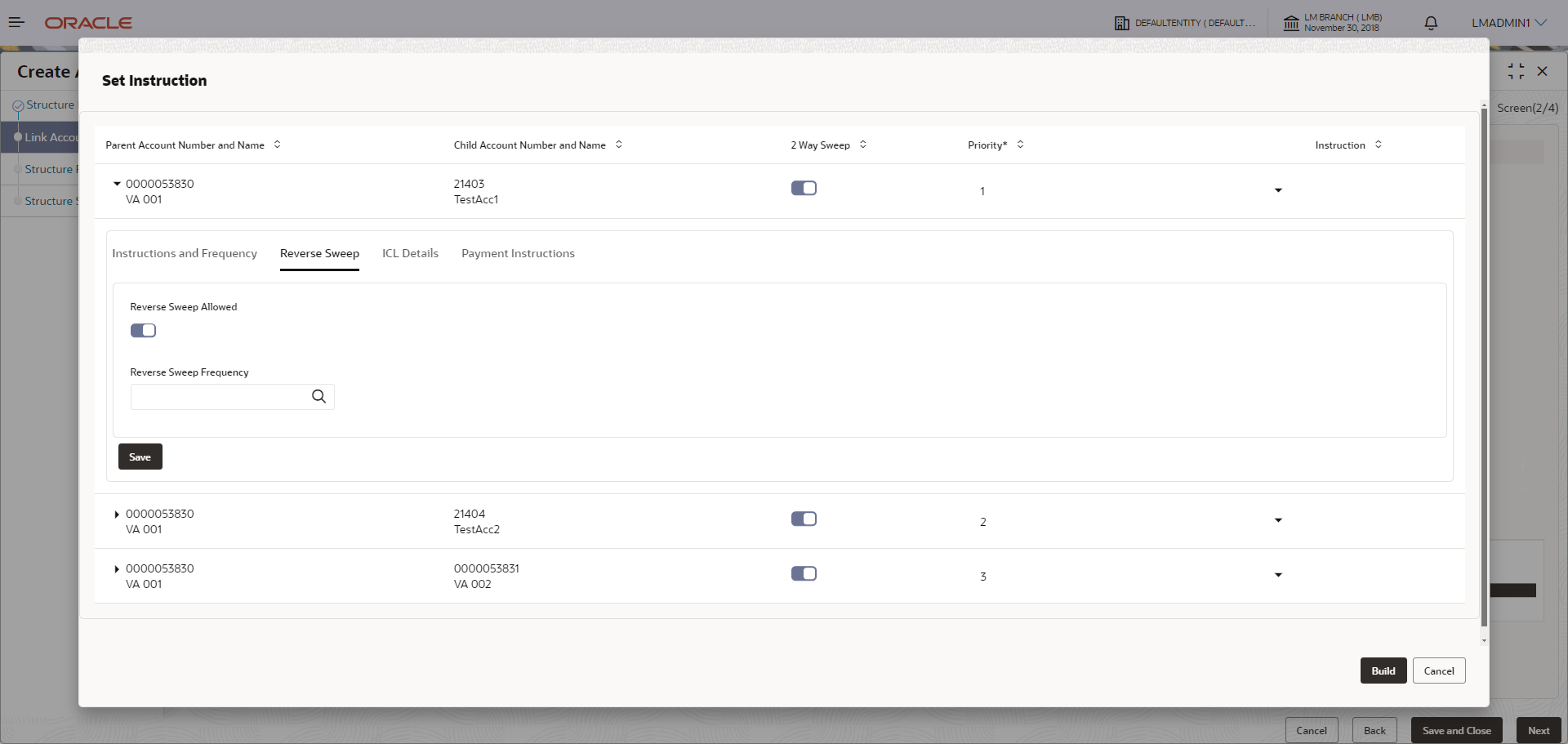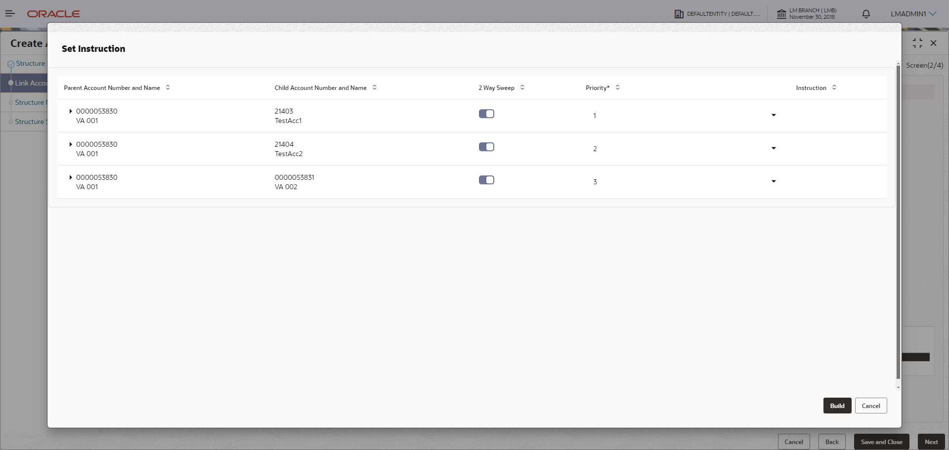 Field Description Parent Account No & Name Displays the parent account number & name of the structure. Child Account No & Name Displays the child account number & name of the structure. 2 Way Sweep Select the toggle to enable the two-way sweep for the account pair Priority Specify the sweep priority used to determine the order of execution across pairs at a level in the structure. Instruction Displays the instruction type for the account pair. - Click Expand icon to view the instructions for the account pair.