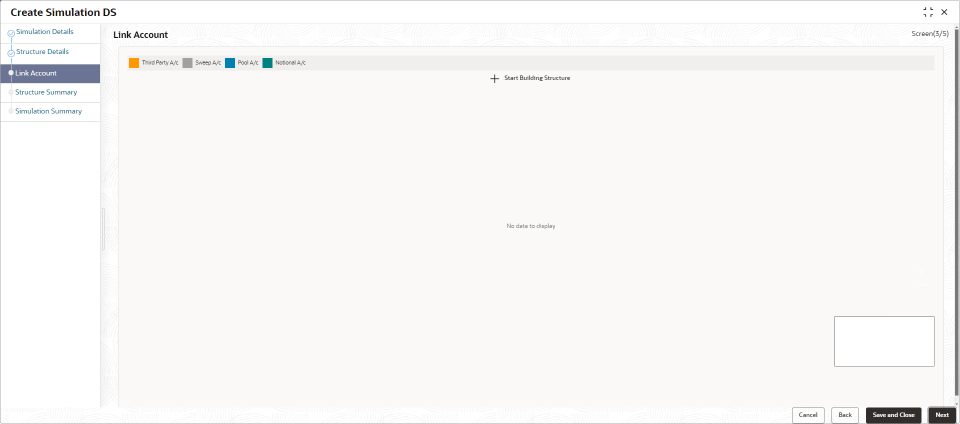 Field Description Filter Account Specify and search the complete or partial account details to display the list of accounts that matches across the fields. Account Number Displays the account number for the simulation structure creation. Account Description Displays the description of the account. Branch Code Displays the branch code for the account. Entity ID Displays the Entity ID for the account. Entity Name Displays the name of the Entity ID. Currency Displays the currency of the account. Account Type Displays the account type. The available options are- External (An account which is external to the Bank and linked for liquidity management)