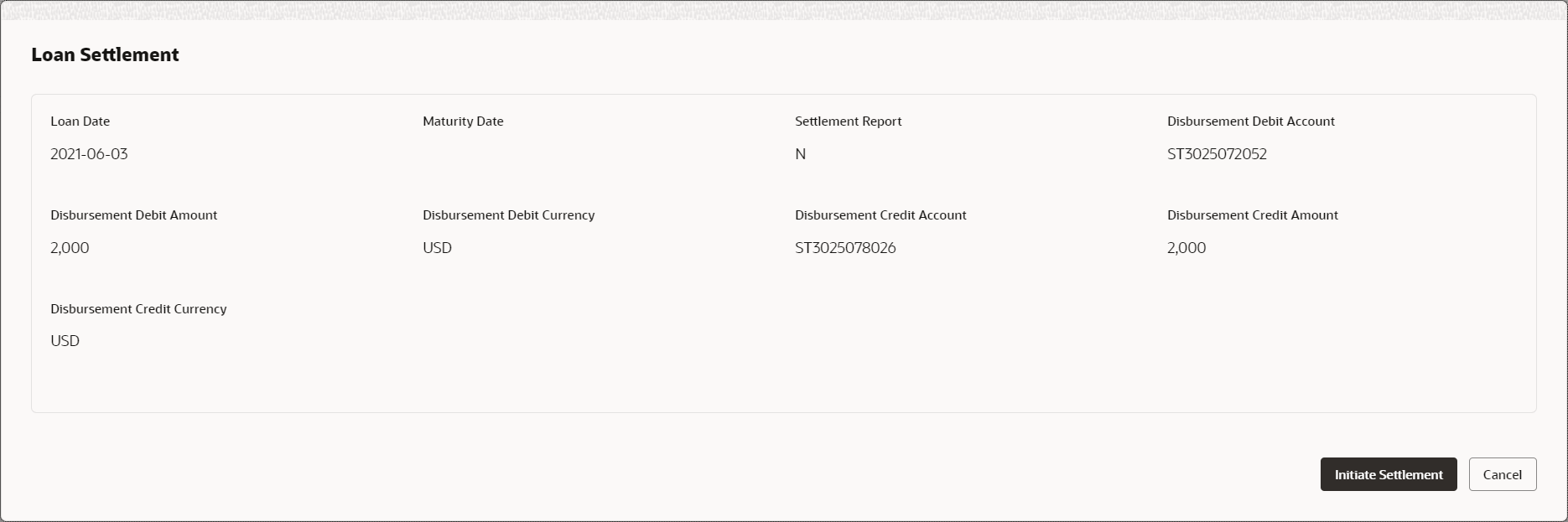 Field Description Loan Date Displays the date on which the loan is booked. Maturity Date Displays the maturity date of a loan, if it is fixed tenure loan. Else, this field will be blank. Settlement Report Displays whether the settlement report is to be generated. Disbursement Debit Account Displays the lenders account. Disbursement Debit Amount Displays the amount that is debited from the lenders account. Disbursement Debit Currency Displays the currency of the lenders account. Disbursement Credit Account Displays the borrowers account. Disbursement Credit Amount Displays the amount that is credited in borrowers account. This amount could be different that the “Disbursement Debit Amount” if the currencies are different. Disbursement Credit Currency Displays the currency of the borrowers account. The Initiate Settlement initiates the repayment process. After successful settlement transaction, the loan is marked as Settled.