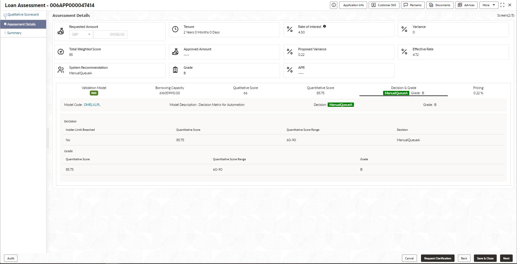 The weightage score also displays in the respective applicant’s tab in case of the multiple applicants.Quantitative Score - Scoring Details Displays the scoring details related to Quantitative Score. Feature Displays the feature configured in the Quantitative Scoring Model. Value Displays the value of the application for the configured feature. Range Type Displays the range type configured in the Quantitative Scoring Model. Range Displays the range for the value of the application. Weightage % Displays the weightage percentage configured for the feature. Score Displays the score configured for the range. Weightage Score Displays the calculated weightage for each feature. Decision and Grade Displays the field details related to Decision and Grade. Model Code Displays the model code configured for the product. Model Description Displays the description of the model code. Decision Displays the recommended decision for the application. Grade Displays the recommended grade for the application Decision and Grade – Decision Displays the field details related to Decision. Quantitative Score Displays the overall quantitative score of the application. Quantitative Score Range Displays the range for the quantitative score. Decision Displays the decision configured for the quantitative score. Decision and Grade – Grade Displays the field details related to Grade. Quantitative Score Displays the overall quantitative score of the application. Quantitative Score Range Displays the range for the quantitative score. Grade Displays the grade configured for the quantitative score. Pricing Displays the field details related to Pricing. Pricing Model Code Displays the pricing model code configured for the product. Model Description Displays the description of the pricing model code. Rate Type Displays the rate type. Rate Percentage Displays the rate percentage. Loan Amount Displays the loan amount. Loan Tenure Displays the loan tenure. Loan Amount Range Displays the range for the loan amount. Loan Tenure Range Displays the range for the loan tenure. Rate % Displays the rate of interest configured for the range. Note: