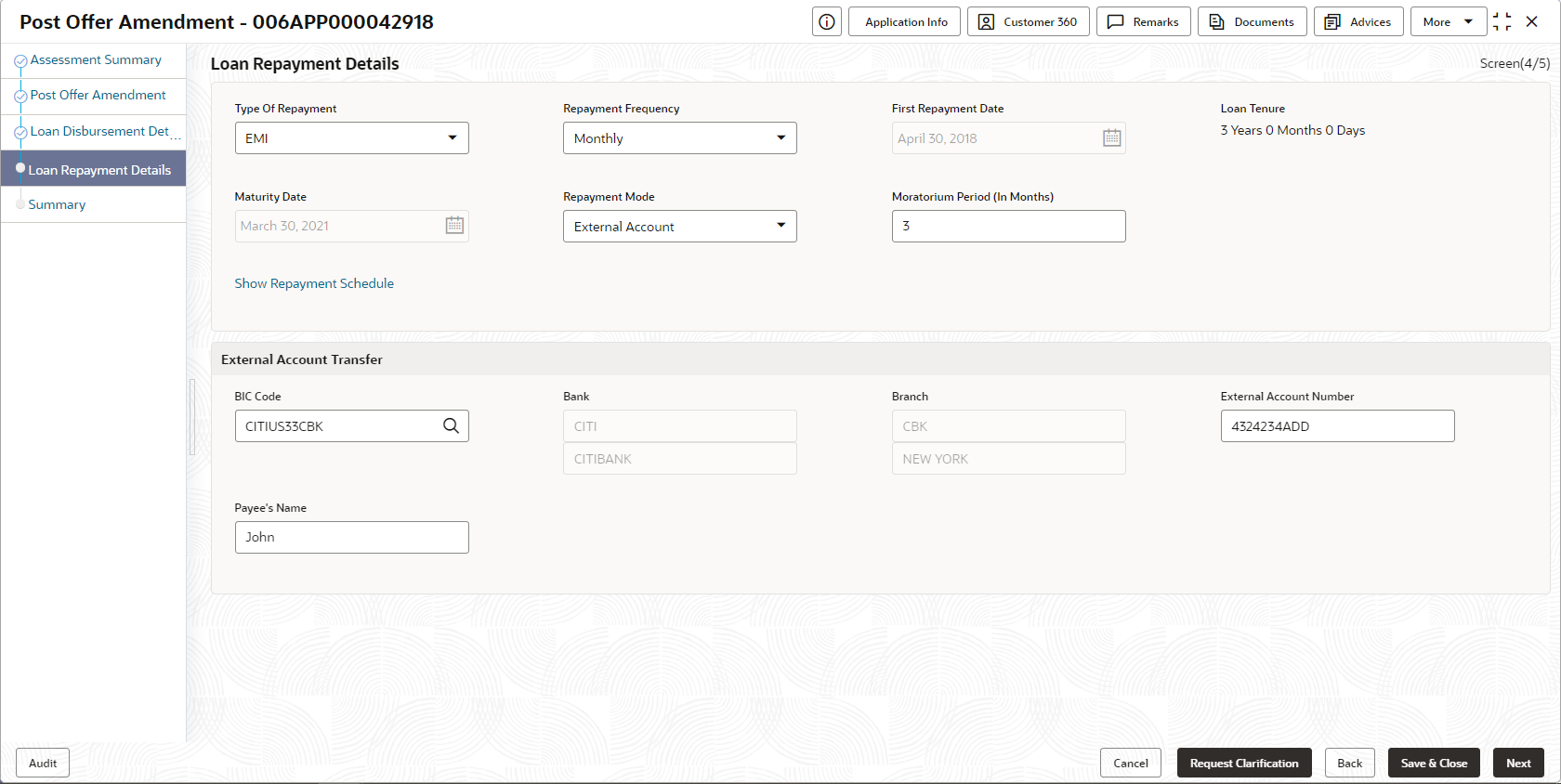 - Capture Later - If the mode selected is Capture Later, the system will allow to proceed with the loan origination flow without capturing the repayment details.
