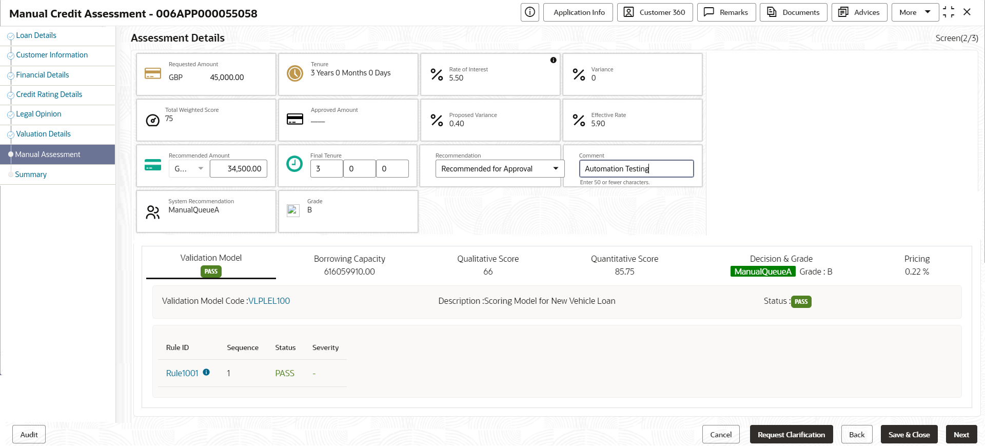 - Specify the fields on Manual Assessment screen.For more information on fields, refer to the field description table. Refer to Assessment Details screen for the detailed explanation of Validation Model, Borrowing Capacity, Qualitative Score, Quantitative Score, Decision & Grade, and Pricing tabs.