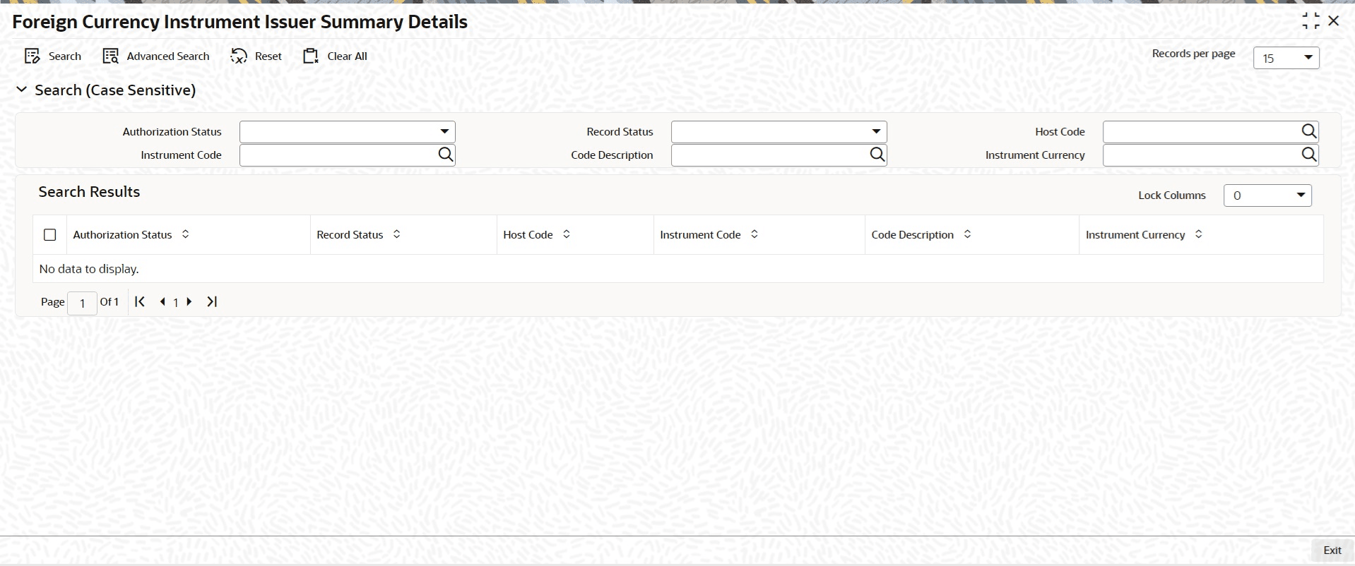 2.1.4.4 Foreign Currency Instrument Issuer Summary On Homepage, specify PISFCISR in the text box, and click next arrow.Foreign Currency Instrument Issuer Summary screen is displayed. Figure 2-8 Foreign Currency Instrument Issuer SummaryDescription of "Figure 2-8 Foreign Currency Instrument Issuer Summary" Search using one or more of the following parameters: Authorization Status Record Status Host Code Instrument Code Code Description Instrument Currency Once you specified the parameters, click the Search button.System displays the records that match the search criteria. Parent topic: Foreign Currency Instrument Issuer