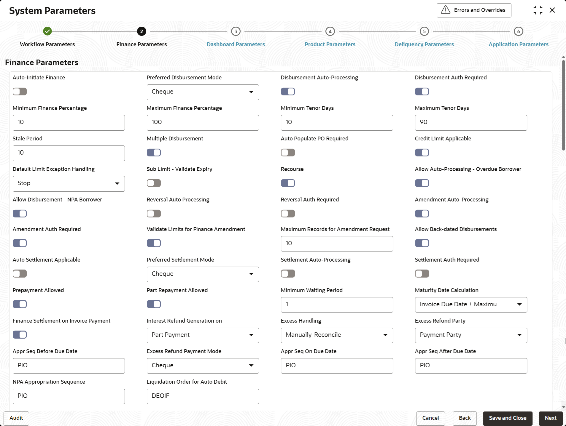 During version upgrade, the system will read the value of Liquidate Pre-Shipment finances for Invoice Disbursement and update the data for Pre-Shipment Finance Liquidation Preference and Liquidation Order for Auto Debit fields in Post-shipment programs based on this maintenance in the System Parameters. A migration script will be prepared for relevant Post-shipment programs during upgrade. - Click Next button.The System Parameters - Finance Parameters screen displays.