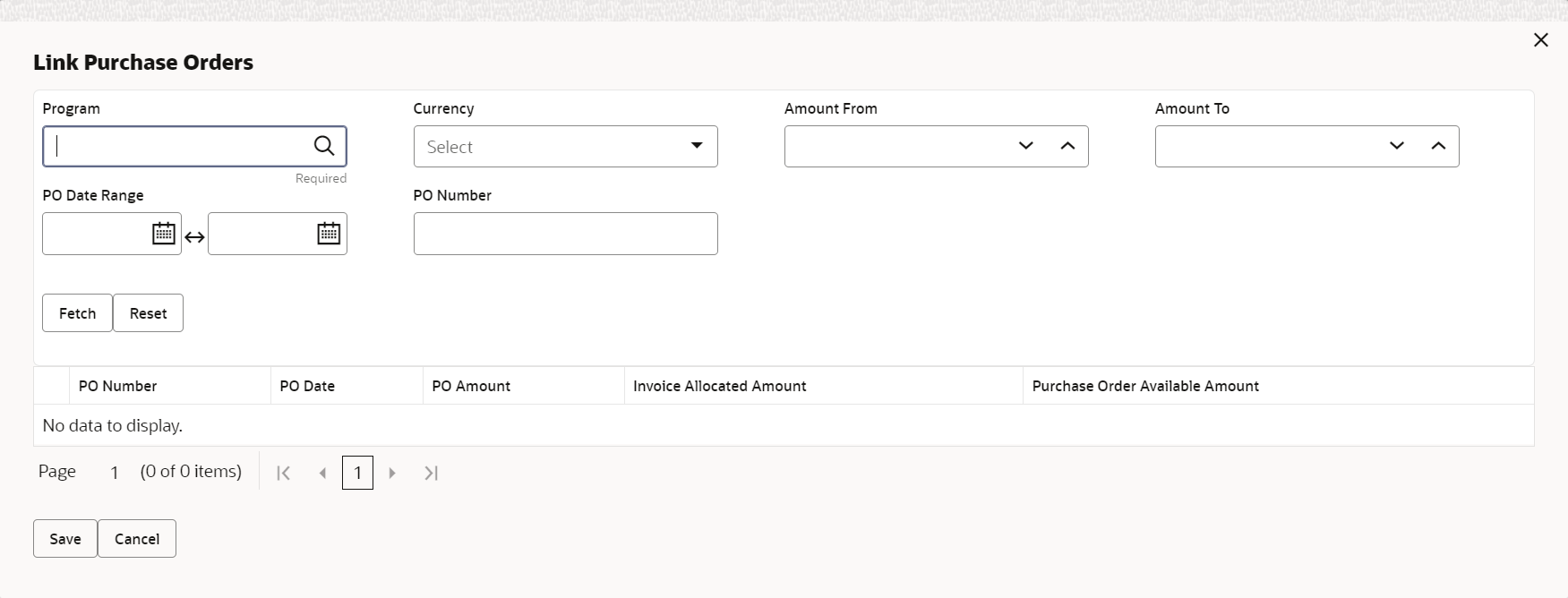 - On the Link Purchase Orders screen, specify the required search criteria and click Fetch.The relevant purchase order records are displayed.