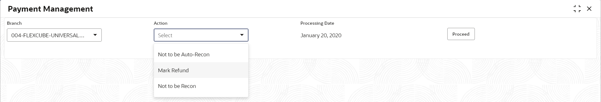 • Mark for Refund: To mark the unreconciled portion of a payment for refund. This action is applicable only to unreconciled or part-reconciled payments, which are not in processing stage, and which have flags set to ‘I’ (invoice), or ‘F’ (finance), or null.
