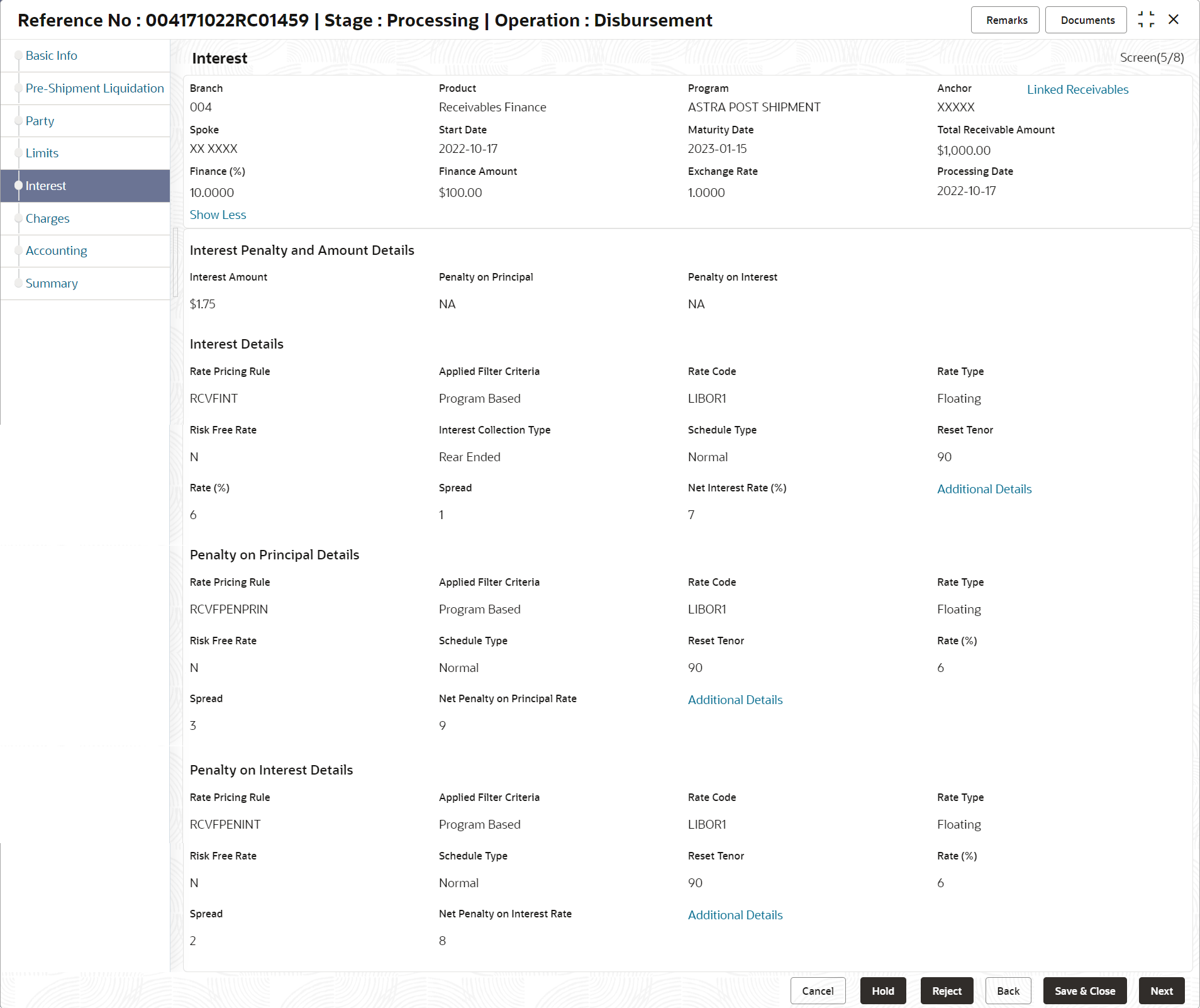 Field Name Description Branch Displays the branch where the disbursement is being processed. By default, the logged-in user’s branch is displayed. Product Displays the name of the product associated with the program. Program Displays the name of the program that is linked to the receivables being financed. Anchor Displays the name of the anchor party in the program. Linked Receivables/PO Click the link to view a list of receivables (invoices/debit notes) / PO that is being financed. Spoke Displays the name of the counter party in the program. Start Date Displays the start date of the finance. By default, it is the current business date. Maturity Date Displays the maturity date of the finance. Maturity date gets calculated basis maturity date parameter selected at product level. Total Receivable/PO Amount Displays the total amount of the receivables/PO being financed. Finance (%) Applicable Finance % is displayed in this field. The Finance amount and consequently the finance percentage can be changed in the disbursement initiation stage. Finance Amount Finance Amount finalized and captured during the initiation stage is displayed. The field displays the Finance (%) value of the Total Receivable Amount. Exchange Rate Displays the exchange rate between the receivable/PO amount currency and the finance currency. Processing Date Displays the date of processing of the disbursement. Pre-Shipment Settlement Amount Displays the total pre-shipment settlement amount appropriated against the relevant outstanding pre-shipment finances.