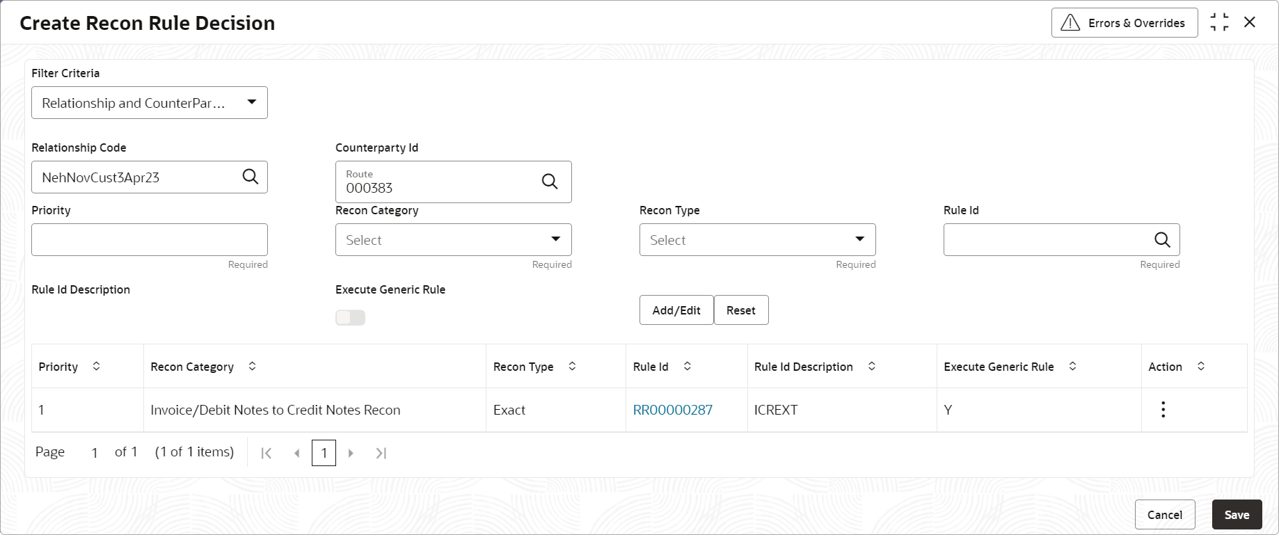 Counterparty Id Click the Search icon and select the counterparty to setup the recon rule for. This field is displayed only if the Filter Criteria is selected as CounterParty Based.