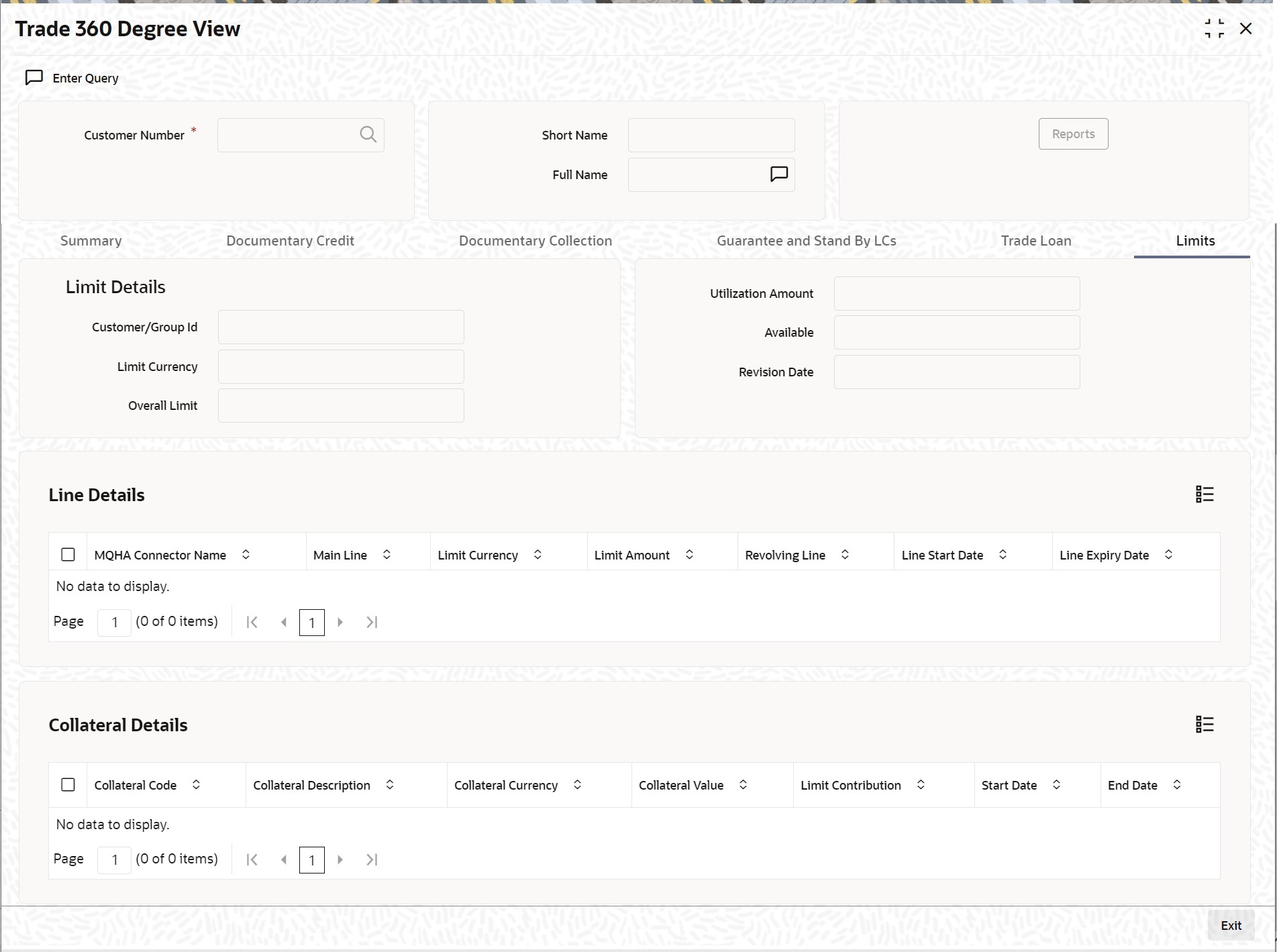 Field Description Limit Details This section displays the limit details. Customer/Group ID This field displays the customer or group Id. Utilization Amount This field displays the customer or group Id. Limit Currency This field displays the customer or group Id. Available This field displays the customer or group Id. Overall Limit This field displays the customer or group Id. Revision Date This field displays the customer or group Id. Line Details Following details are displayed in this section. - Line Identification