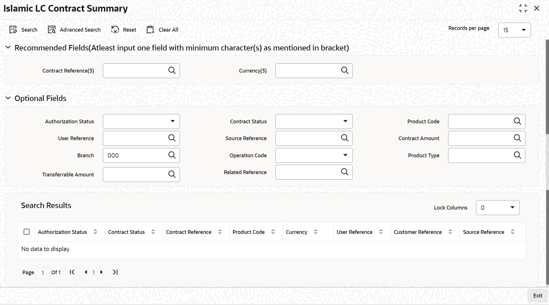 1. On the Islamic LC Contract Summary screen, select appropriate Contract Reference from the option list and click on Search.