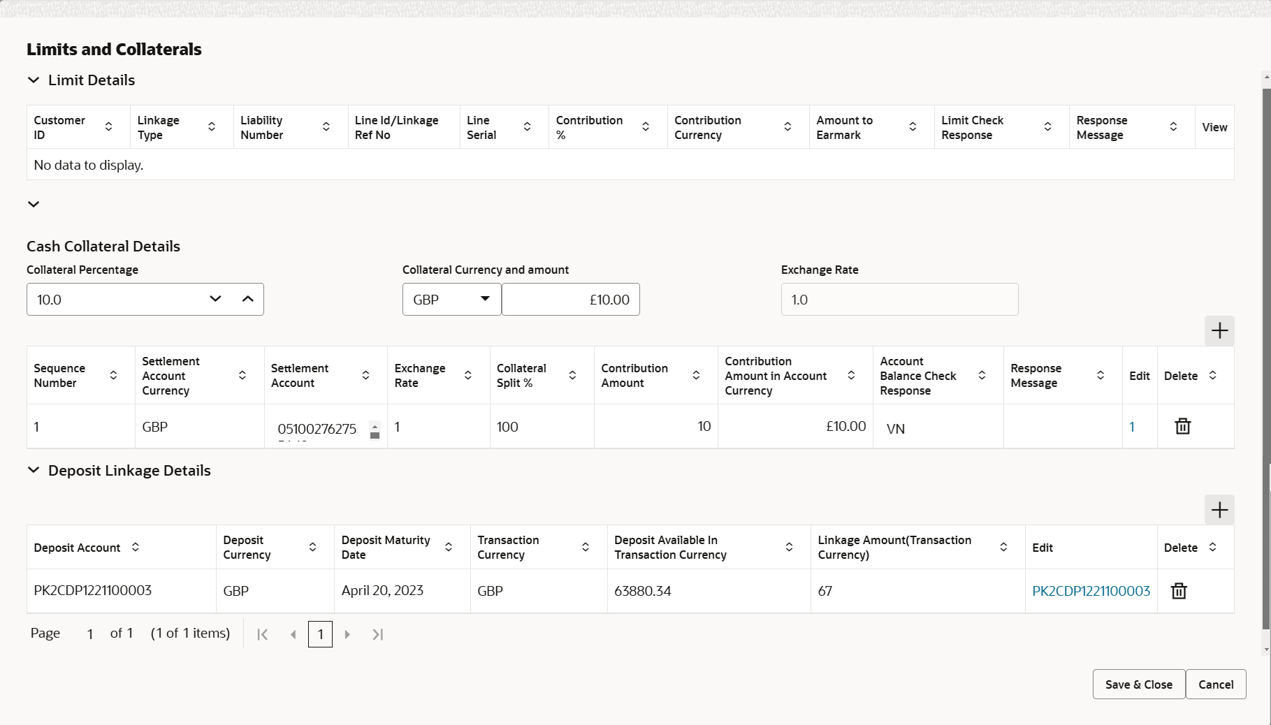 Deposit Details grid Below fields appear in the Deposit Details grid along with the above fields. Deposit Currency This field displays the deposit currency. Transaction Currency This field displays the transaction currency. Edit Click edit link to edit the deposit linkage details. - Click Save and Close to save the details and close the