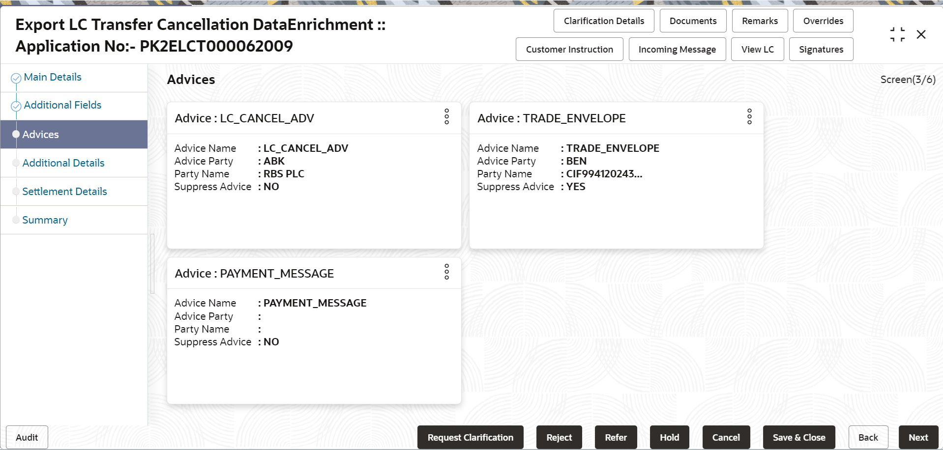This topic provides the systematic instructions to capture the advices details of Export LC Transfer Cancellation process.