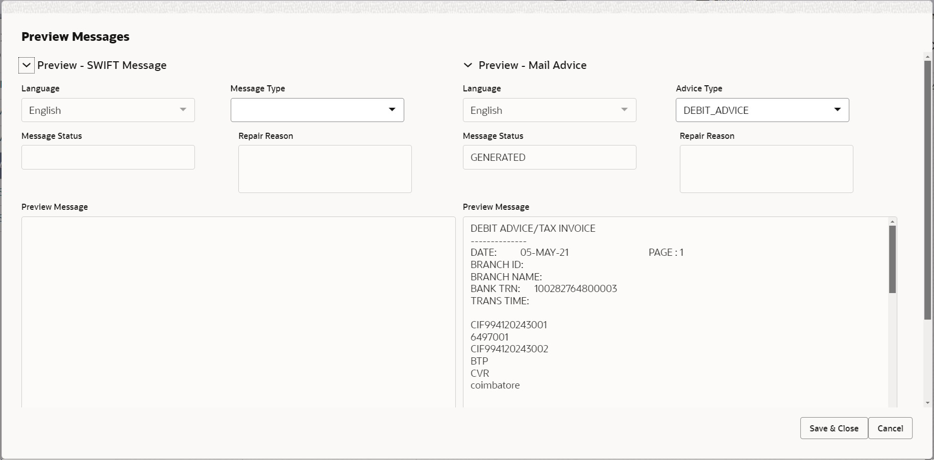 Preview Message This field displays a preview of the draft message. Preview Mail Advice This section displays the preview of mail advice details. Language Read only field. English is set as default language for the preview.
