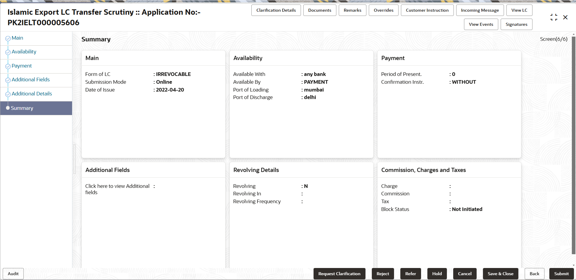 This topic provides the systematic instructions to view the summary details in Scrutiny stage of Export LC Transfer - Islamic request.