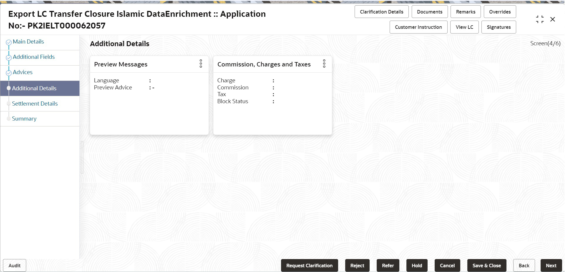 This topic provides the systematic instructions to capture the additional details in Data Enrichment stage of Export LC Transfer Closure - Islamic process.