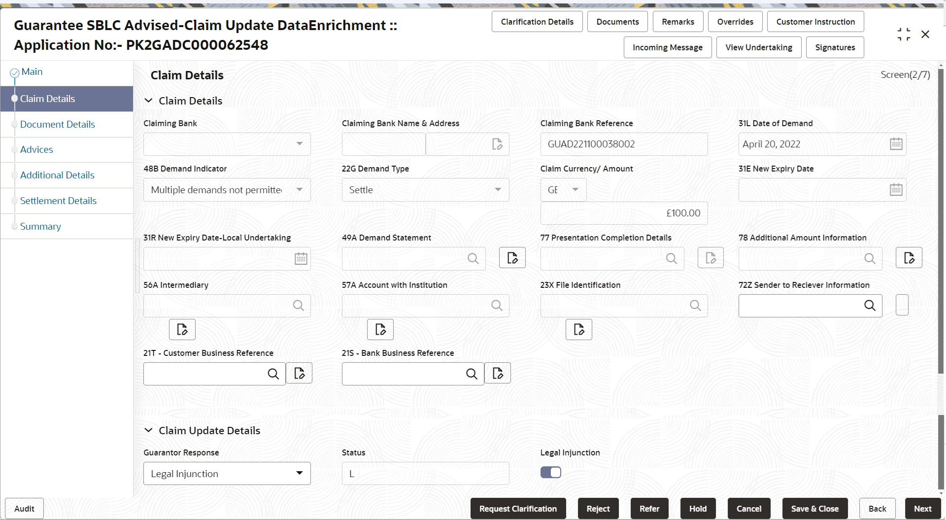 This topic provides the systematic instructions to capture the additional details in Data Enrichment stage of Guarantee SBLC Advised Claim Update process.