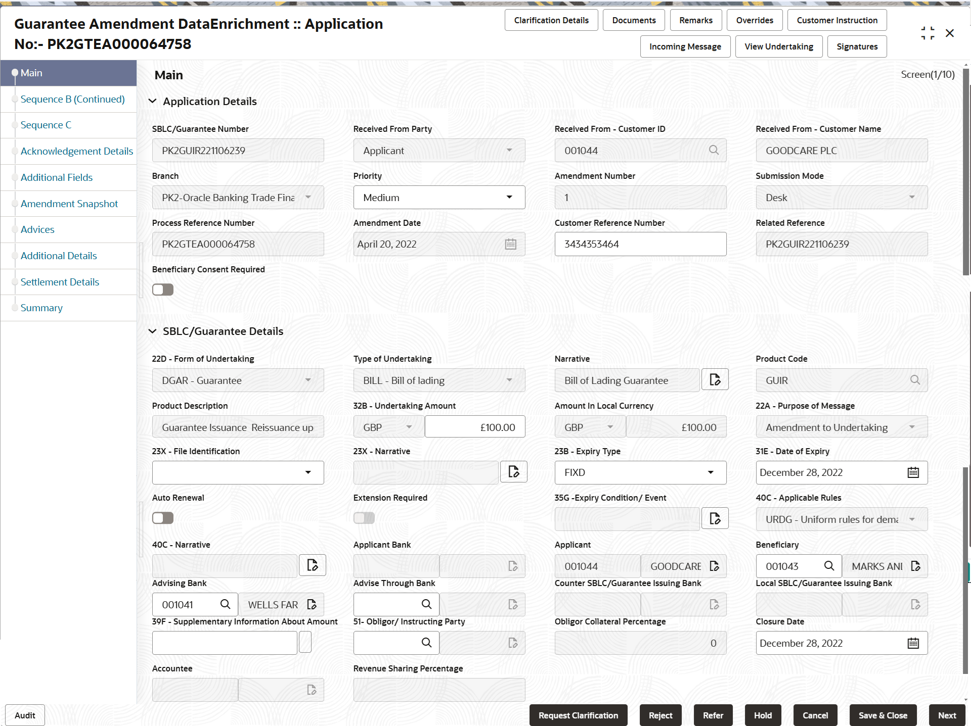This topic provides the systematic instructions to initiate the main details of Data Enrichment stage of Guarantee Amendment request.