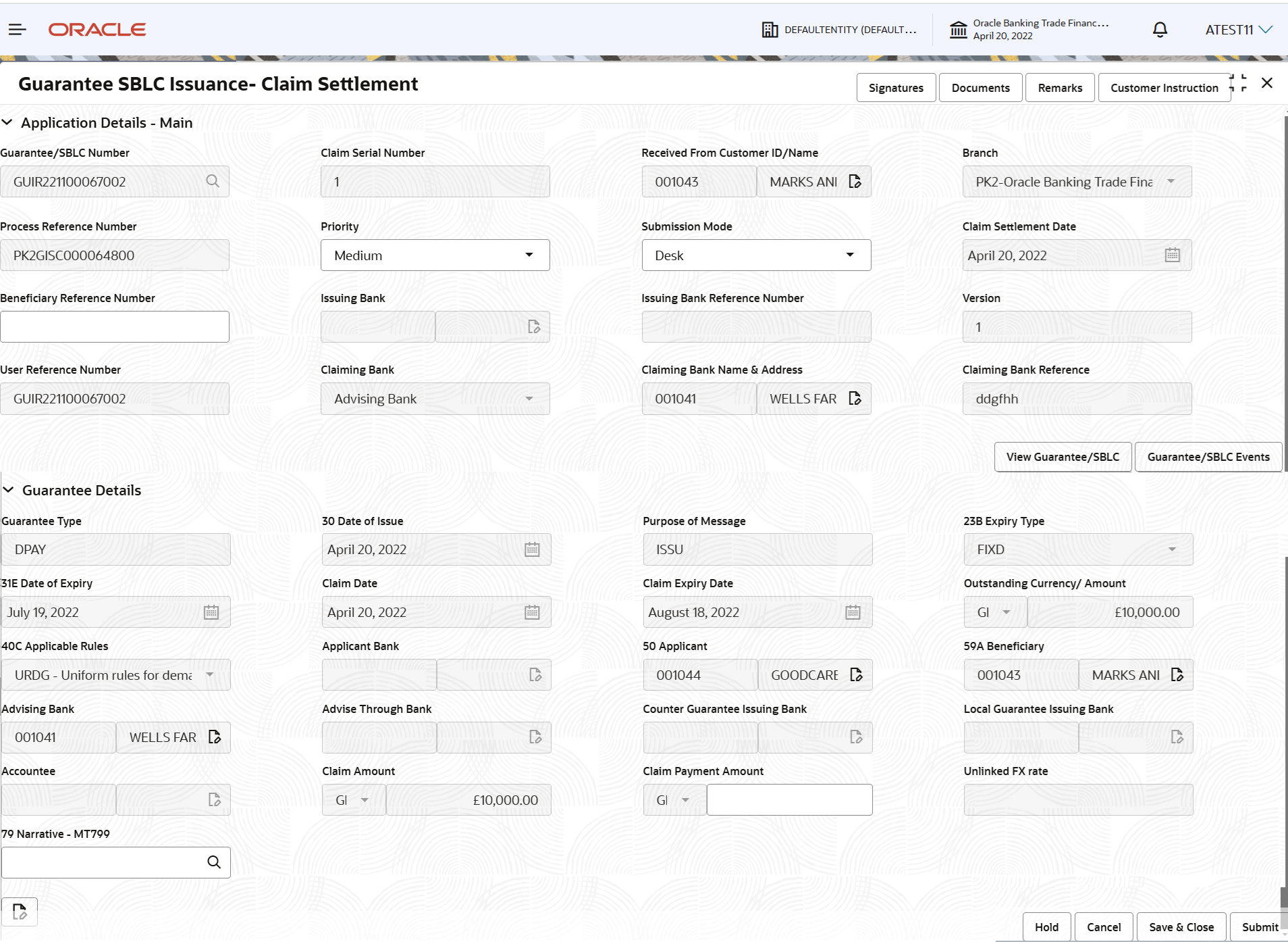 Description of "Figure 2-3 Guarantee SBLC Issuance - Claim Settlement"The Guarantee SBLC Issuance - Claim Settlement screen appears.The Guarantee SBLC Issuance Claim Settlement - Registration stage has two sections Application Details and Guarantee Details. Let’s look at the details of Registration screens below: