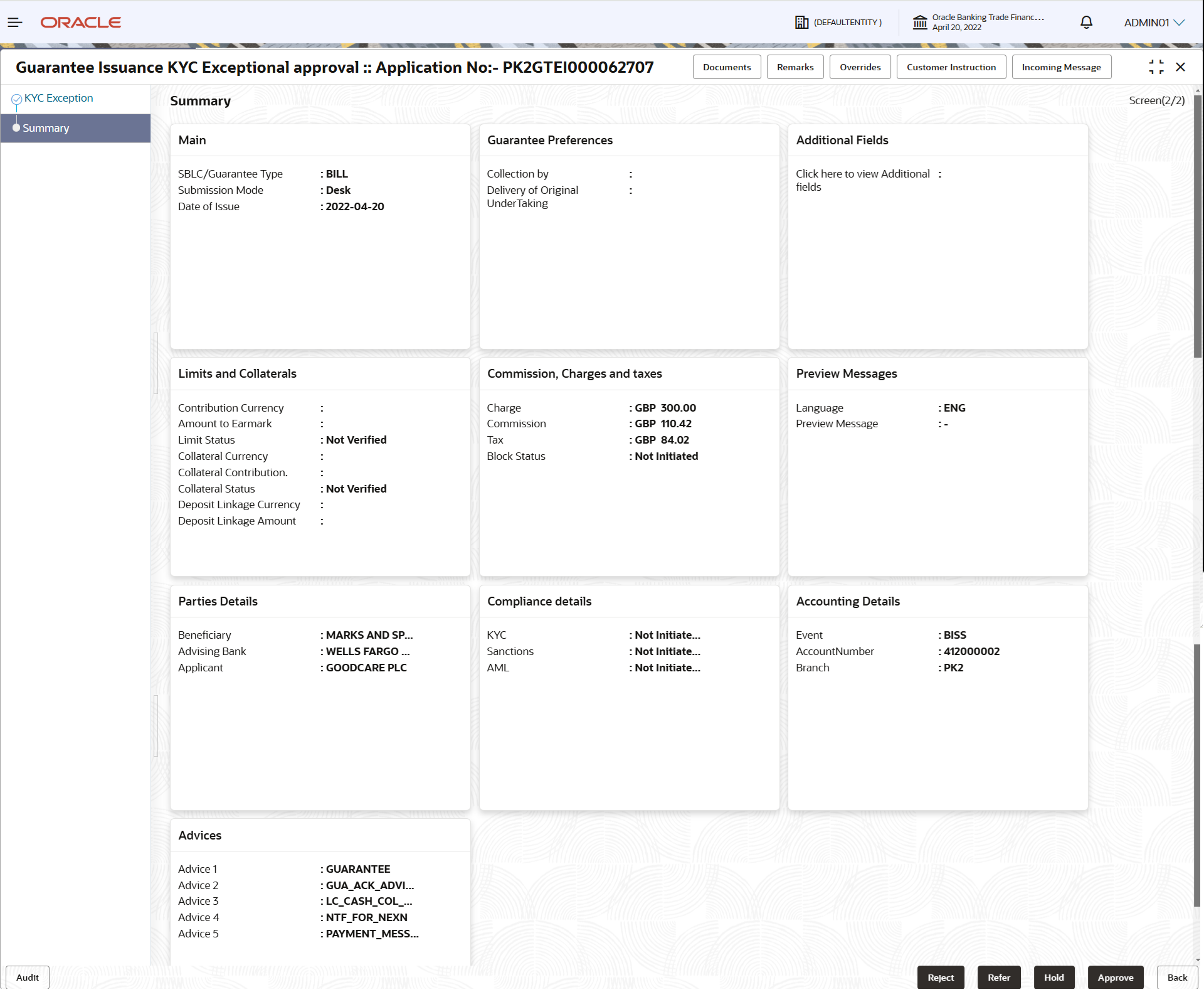 The Guarantee Issuance request, before it reaches the approval stage, the application will validate the Amount Block, KYC and AML. If any of these failed in validation will reach exception stage for further clearance for the exceptions.