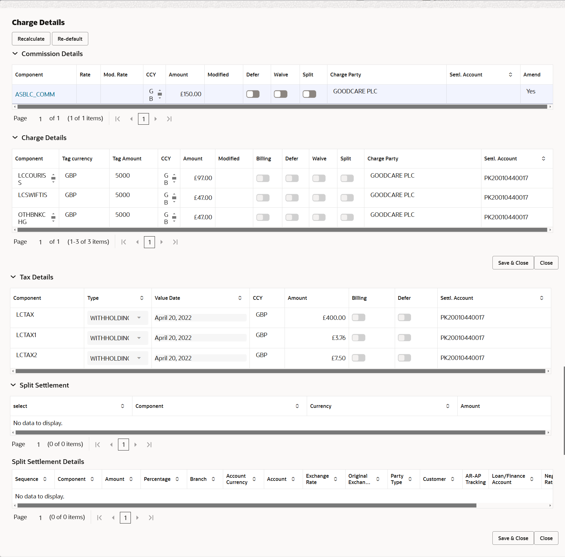 Charge Party Charge party is applicant by default. User can change the value to beneficiary. Settl. Accnt Select the settlement account. Tax Details This section displays the tax details. The tax component is calculated based on the commission and defaults if maintained at product level. User cannot update tax details and any change in tax amount on account of modification of charges/ commission will be available on click of Re-Calculate button or on hand off to back-end system.