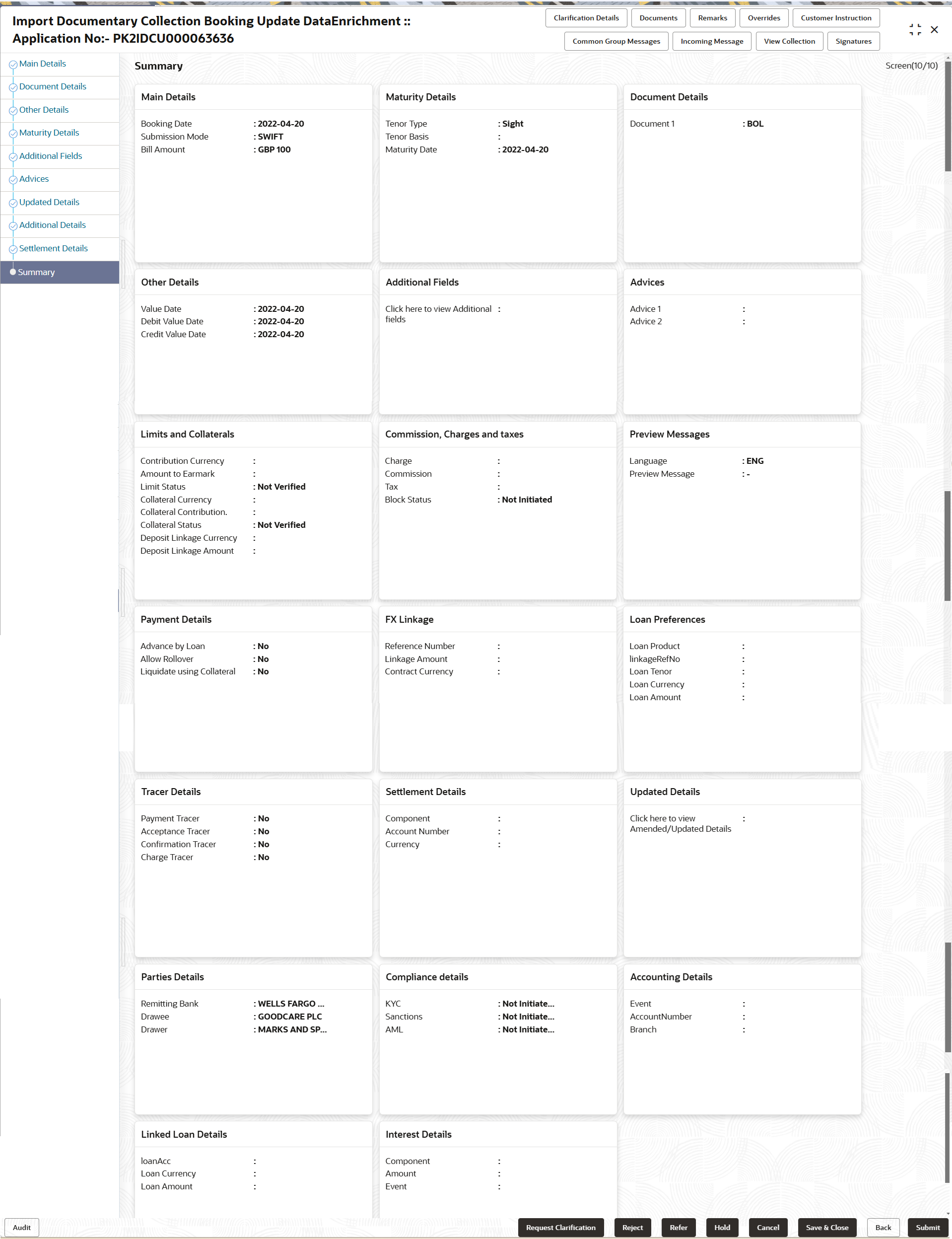 This topic provides the systematic instructions to view the summary of Import Documentary Collection Booking Update request.