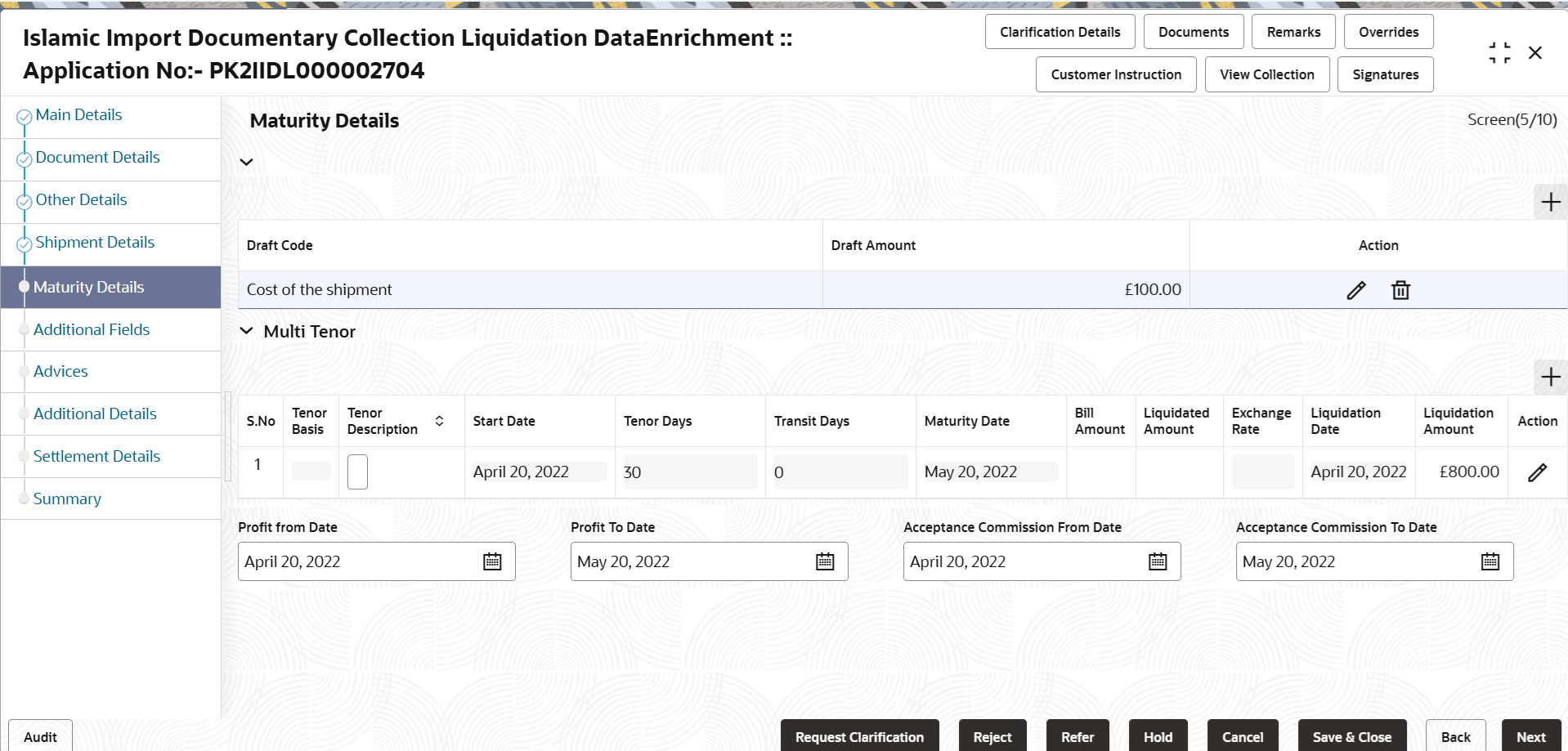 This topic provides the systematic instructions to capture the maturity details of Islamic import documentary collection liquidation request.