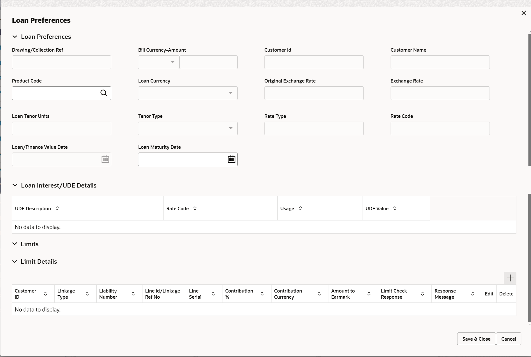 Edit Click edit link to edit the limit details. - Click Save and Close to save the details and close the