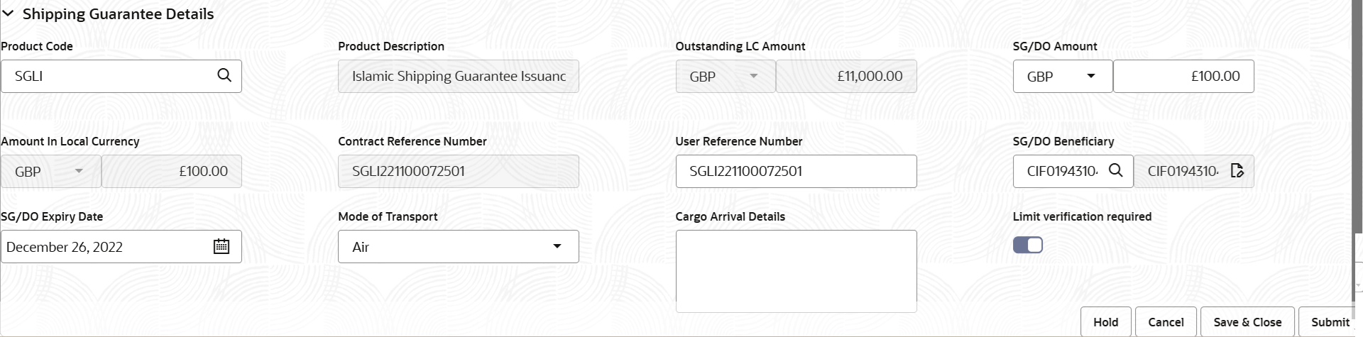 Hold The details provided will be saved and status will be on hold. User must update the remarks on the reason for holding the task. This option is used, if there are any pending information yet to be received from applicant. Cancel Cancels the Shipping Guarantee Issuance - Islamic task. Details entered will not be saved and the task will be removed. Save & Close Save the information provided and holds the task in ‘My Task’ queue for working later. This option will not submit the request.