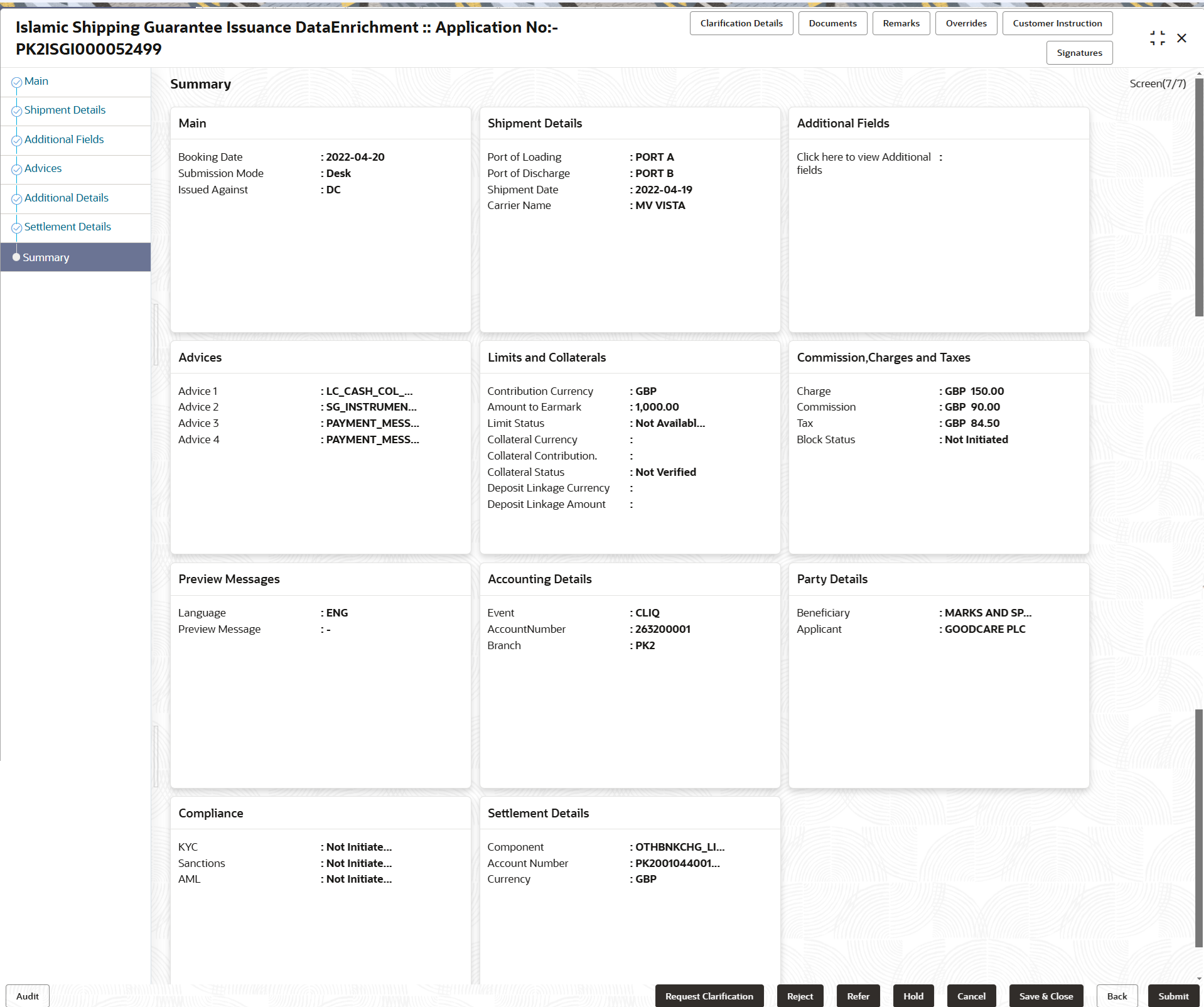 This topic provides the systematic instructions to view the summary details in Data Enrichment stage of Shipping Guarantee Issuance - Islamic process.