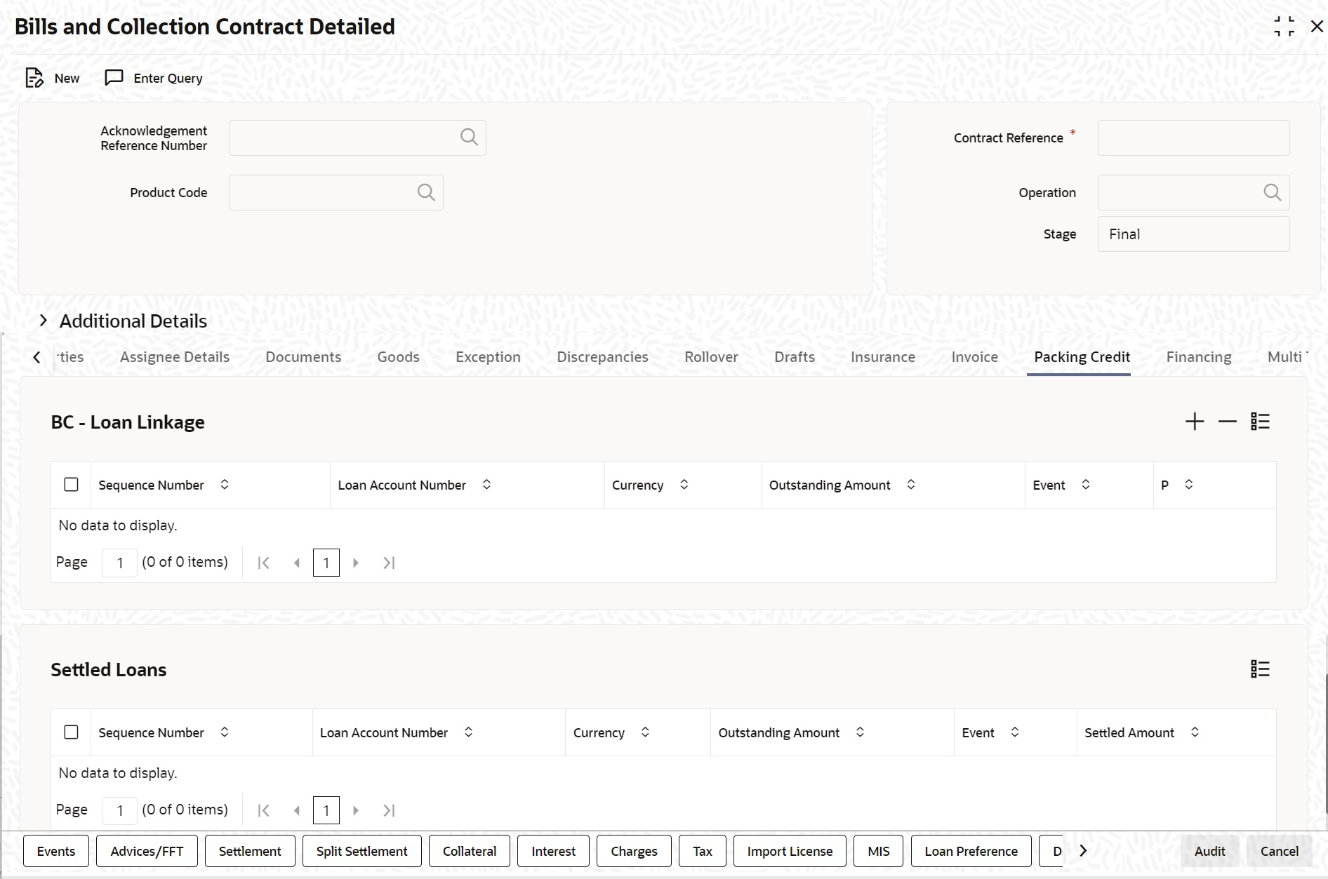 Sequence Number Specify the order in which the system liquidates attached multiple loans. You need not maintain bridge GLs within Loan Products which allow the creation of these Loan accounts as the system replaces the credit settlement bridge with the bridge GL that the BC product maintains, automatically. Loan Account Number Select the Loan Account Number from the option list provided. Event The system defaults the appropriate event code while attaching Loan for liquidation and attempting to save. These include (in case of ial Discount, Purchase or Negotiation operation) and LIQD, BPUR, BDIS, LPUR and LDIS events. Outstanding Amount The system displays the outstanding amount of the Loan contract while attaching the same. Click P to populate information to the field. Currency The system displays the outstanding currency of the Loan contract while attaching the same. Click P to populate information to the field. Settled Amount The system displays the loan amount settled against each event in the Loan currency while liquidating the loan from the bill. Processing Packing Credits attach Packing Credits during purchasing, discounting or liquidation of an Export Bill. The Oracle Banking Trade Finance system throws an error if you attempt to attach Loan accounts during any other event than the latter ones or events on account of direct purchases, discounts and negotiations.