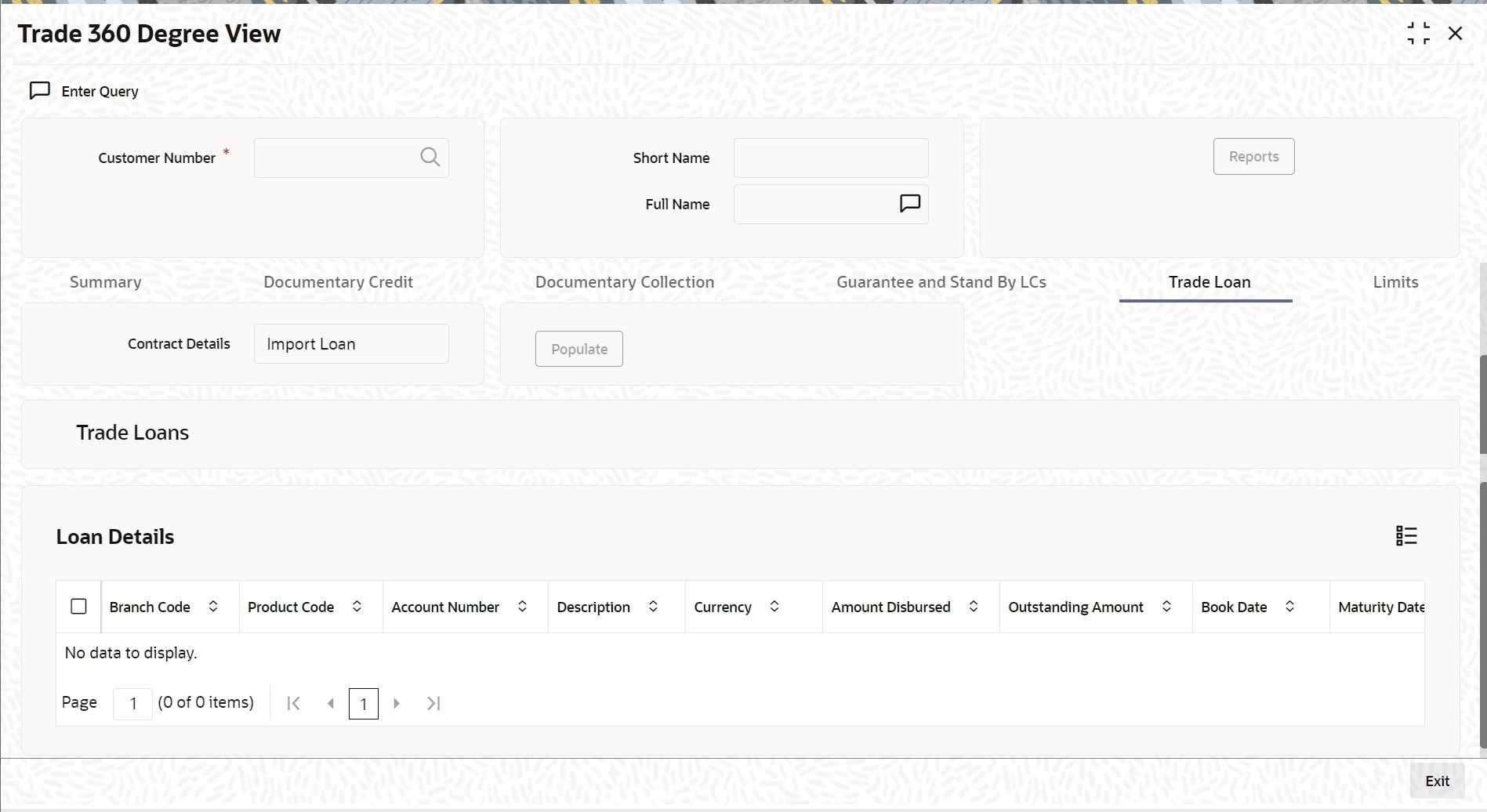 1. On the Trade 360 Degree View screen, click Trade Loans tab.