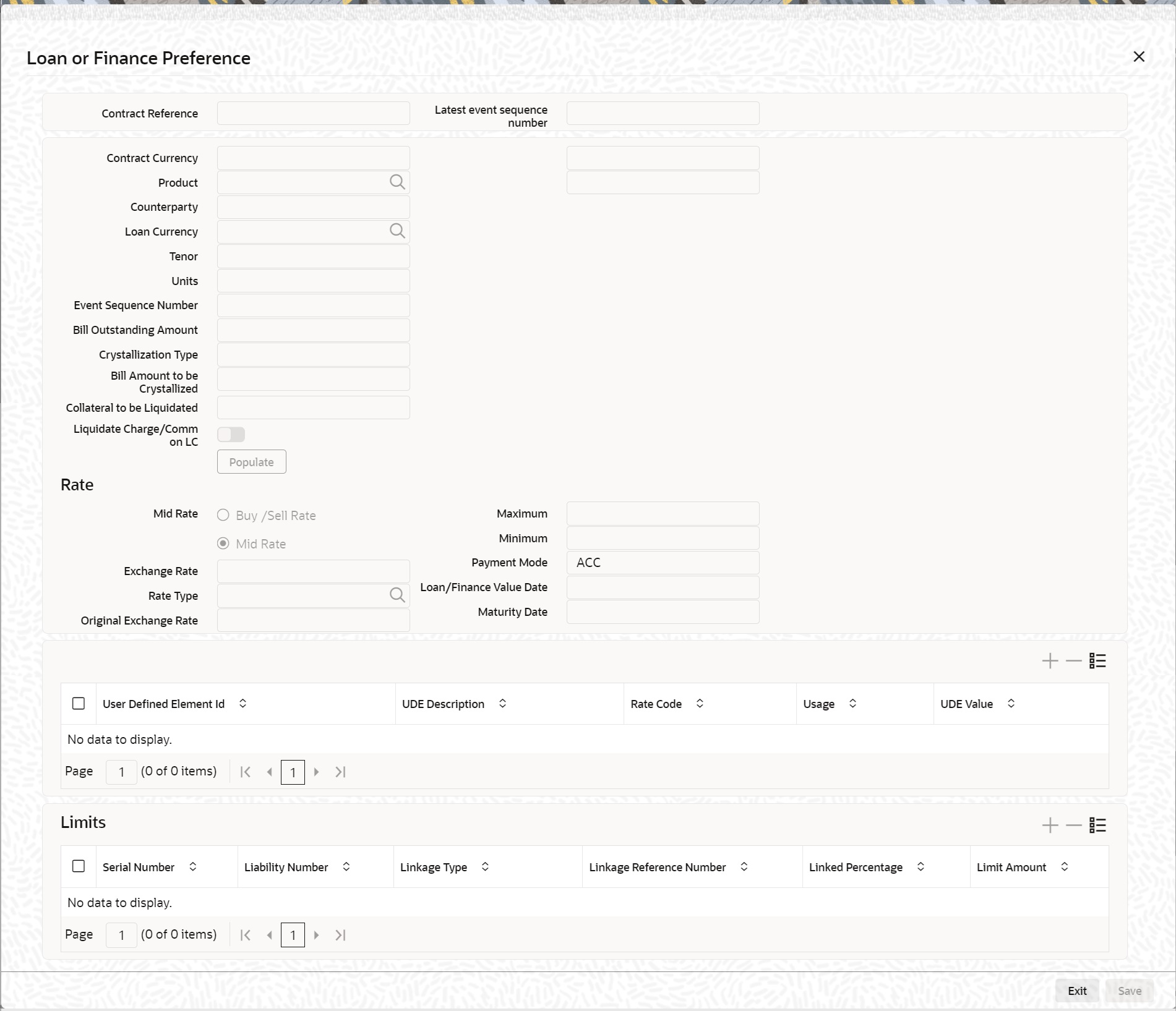 Tabs Details Events Click this link to view details of the events, accounting entries and Messages generated for each event in the life-cycle of a bill. Advices/FFT In the screen corresponding to this link, you can view, suppress and prioritize the advices that are to be generated for a contract. You can also specify the FFTs and Instructions that should accompany the advices generated for the bill. Settlement This invokes the Settlement screen. Based on the details that you enter in the settlement screens, the bill will be settled. The details of these screens have been discussed in the Settlements manual. Split Settlements Click on this link to specify split settlement details of the bill. Collateral In the screen that corresponds with this link, you can reduce the cash offered as collateral for the LC to which the Bill is associated. Charges Click this link to invoke the Contract Charge Details screen. The Charges and Fees manual details the entire procedure of applying charges to a bill. Tax This link invokes the Tax services. On invoking this function you can define a tax scheme, the rule details and the amount details of the contract. The Processing Tax manual details the entire procedure of maintaining tax rules and schemes. It also deals with the linking of a tax scheme to a product and the application of the scheme on a bill’. Import License Click this link to capture import license details, MIS Click this link to define MIS details for the bill. Finance Preference Click on this link to invoke the Finance Preference screen. You can maintain the details of the Finance. Drawer/Drawee IC Click this link to invoke the Drawer/Drawee Profit and Charges screen. You can define the Profit and charge components at the time of initiation of contract. Brokerage Click this link to specify the details of the broker and brokerage. Linkage Details Clicking this link invokes the Contract Linkages screen. Here, you can link the bill to funds available in an account or deposit. Fields Click this link to enter values for custom fields associated with the bill. Effective Profit Rate Click on this link to invoke the Commission and Charges Transfer Screen. Profit Dates Click on this link to capture forfeiting profit computation dates. Finance Accounts Click on this link to preview the linked finance details. Profit This link invokes the Profit and Charges or Fees (ICCB) service. The Processing Profit manual deals with the application of profit on a bill. Message Preview Click this link to view the messages or advices generated for the contract. Charges/Commission Transfer Click this link to invoke the ‘Charges/Commission Transfer’ screen. All Messages Click this link to view all messages associated to contract. Remarks Click this link to invoke the ‘History of Remarks’ screen. Common Group Message Click this link to invoke the common group message screen. Substitution Bills Click this link to invoke the Substitution Bills screen. UDE Click this link to invoke the User Defined Event Triggering screen. FX Linkage Click this link to invoke the FX Linkage screen. Enter valid inputs into all the mandatory fields; or to save the contract. The contract can be saved by either clicking the save icon in the toolbar or selecting Save from the ‘Actions’ menu.