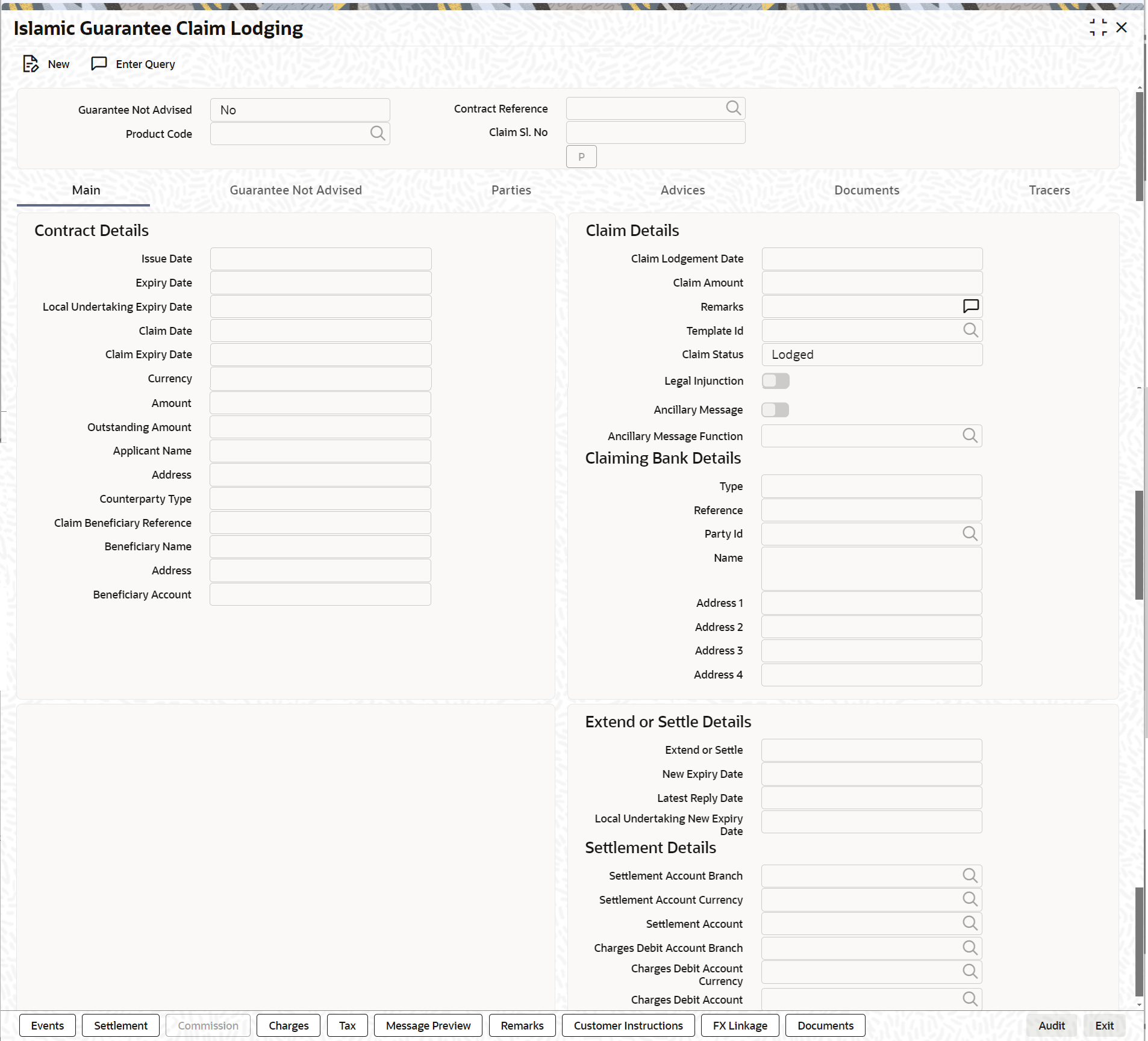New Expiry Date Specify the new expiry date. The New Expiry date is mandatory when 'Query to Extend or Settle’ option is selected. Latest Reply Date Specify the latest reply date. The Latest Reply date is mandatory when 'Query to Extend or Settle option is selected. Local Undertaking New Expiry Date Specify the new expiry date for the local undertaking. Settlement Account Branch The system displays the settlement account branch on selection of the debit account number. Settlement Account Currency The system displays the settlement account currency on selection of the debit account number. Settlement Account The system displays the settlement account details. Charges Debit Account Branch The system displays the charges debit account branch on selection of the charges debit account number. Charges Debit Account Currency The system displays the charges debit account currency on selection of the charges debit account number. Charges Debit Account The system displays the charge debit account details. - On the Islamic Guarantee Claim Lodging screen, click the